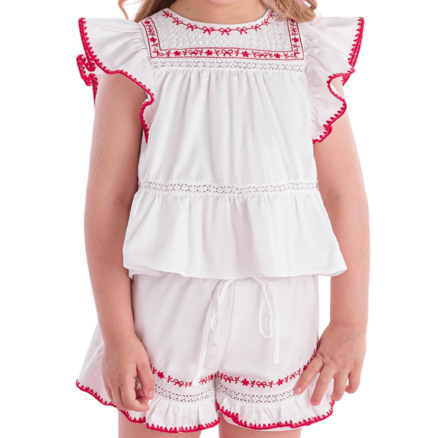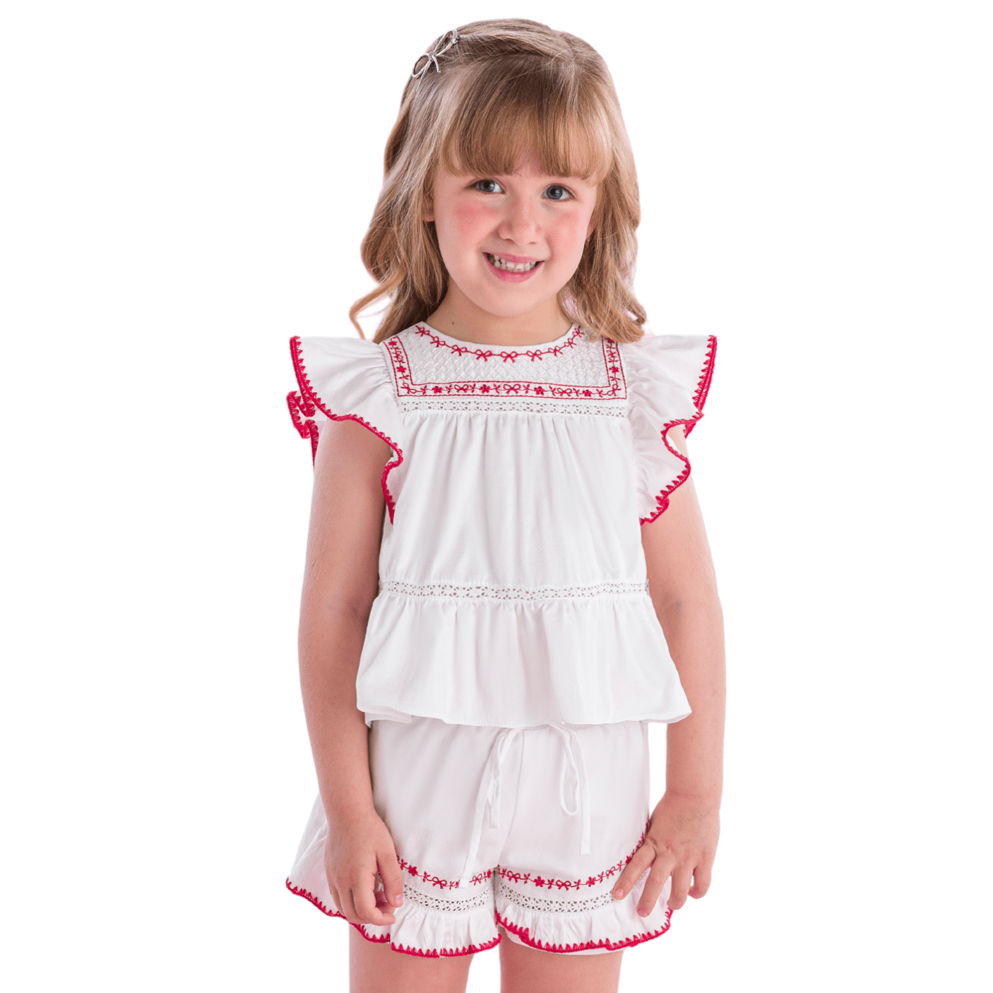A blusa possui recortes delicados, babadinhos nas mangas e bordados manuais com pequenos lacinhos na gola e na pala, criando um toque artesanal e romântico. O short complementa o visual com modelagem soltinha, cós ajustável e barrado bordado combinando com os detalhes da parte superior.