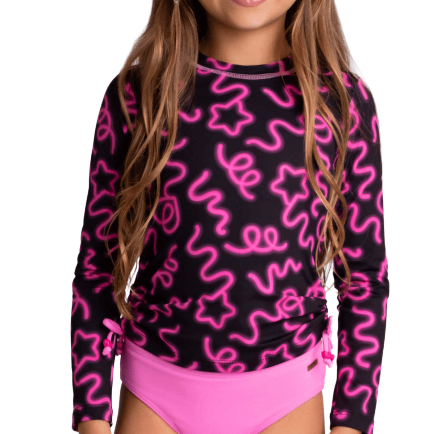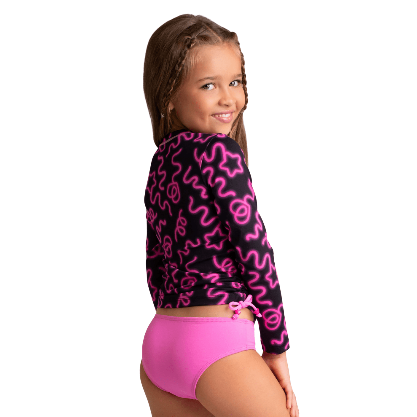 A camiseta de manga longa traz estampa divertida de fitas neon pink sobre o fundo preto — um visual moderno, cheio de atitude e estilo! As laterais ajustáveis com amarração permitem um caimento perfeito e personalizado. A calcinha em rosa neon complementa o conjunto com um toque vibrante e confortável, garantindo liberdade total de movimento.