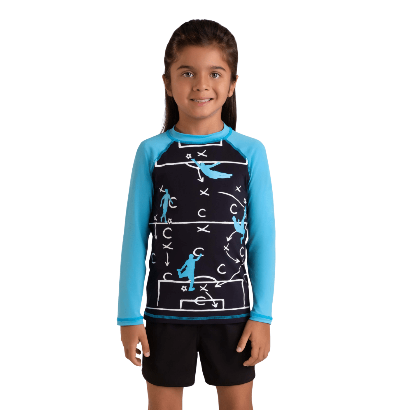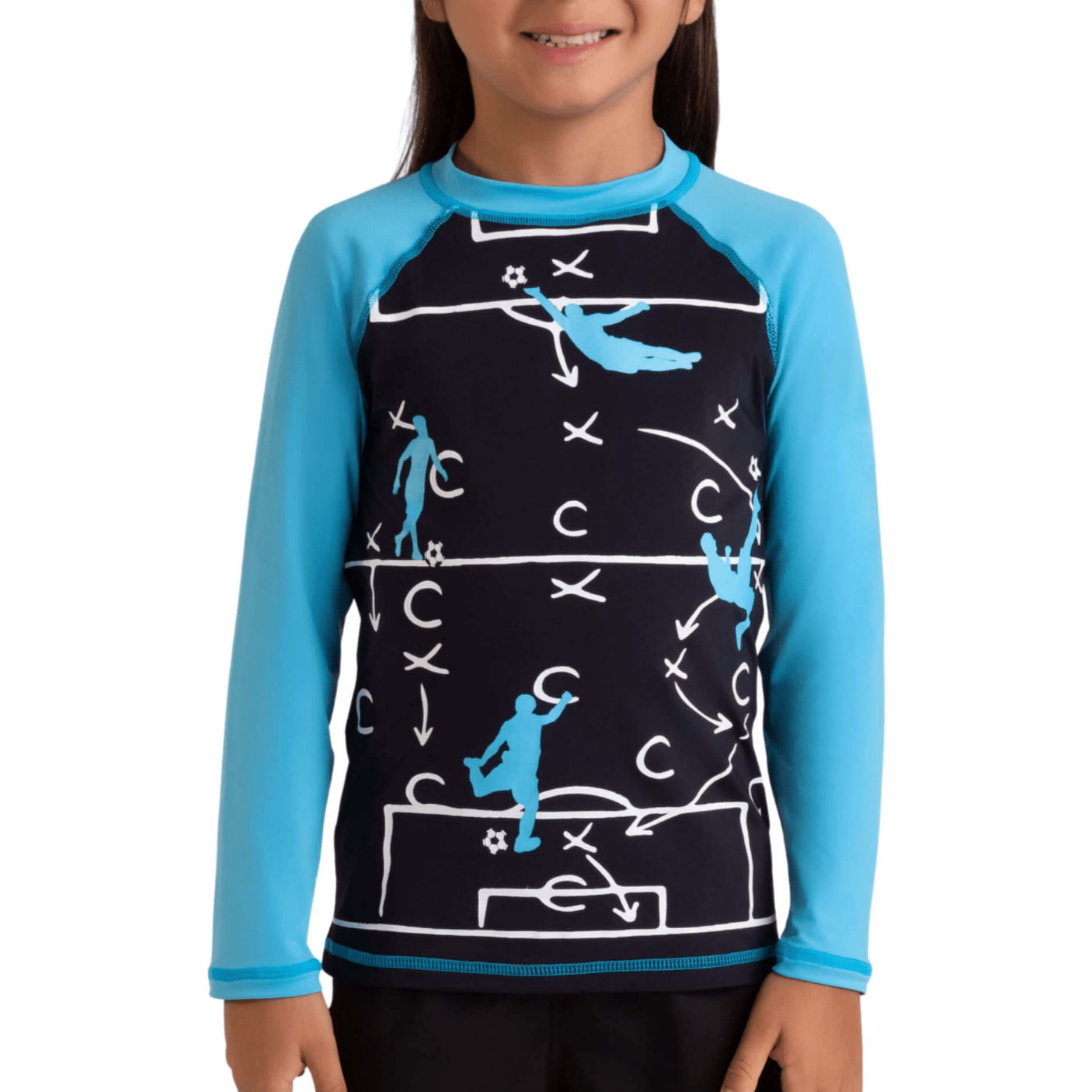 A camiseta com proteção UV 50+ protege a pele dos raios solares enquanto o tecido leve, elástico e respirável garante liberdade total de movimento. As mangas longas oferecem proteção extra, e a estampa esportiva deixa o visual moderno e divertido.