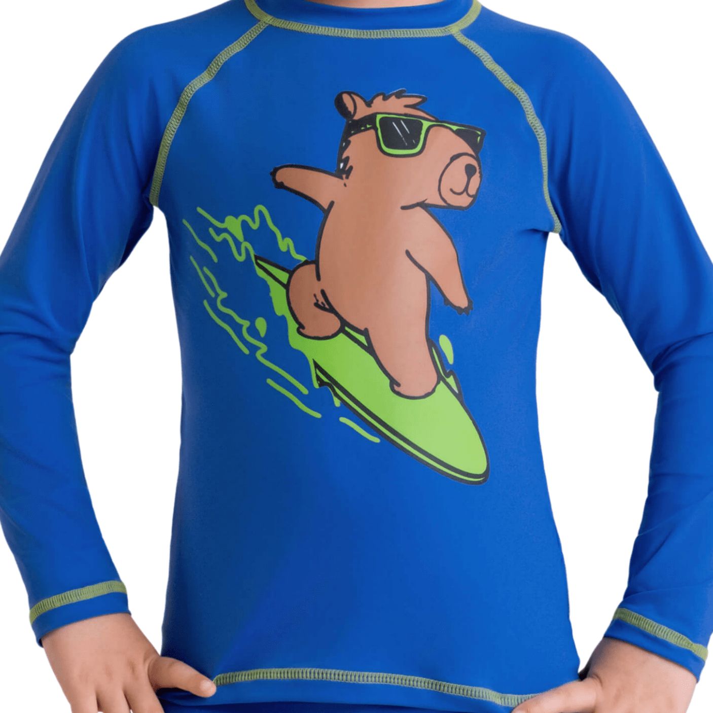 O Conjunto Capivara Surf Azul Dedeka é a escolha perfeita para meninos cheios de energia que adoram o mar, a piscina e as brincadeiras ao ar livre. Com estampa divertida da capivara surfista, ele combina conforto, proteção solar e estilo em um visual alegre e moderno!