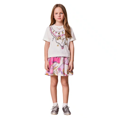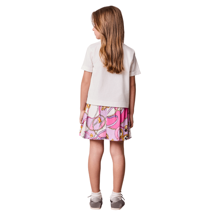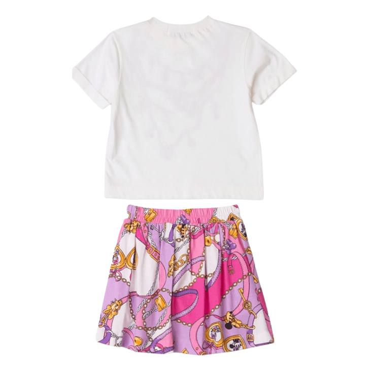 A blusa branca traz estampa de colares com aplicação de strass, criando um efeito sofisticado e moderno. Já a saia em tom rosa com estampa inspirada na Minnie e Daisy adiciona movimento, delicadeza e personalidade ao look.