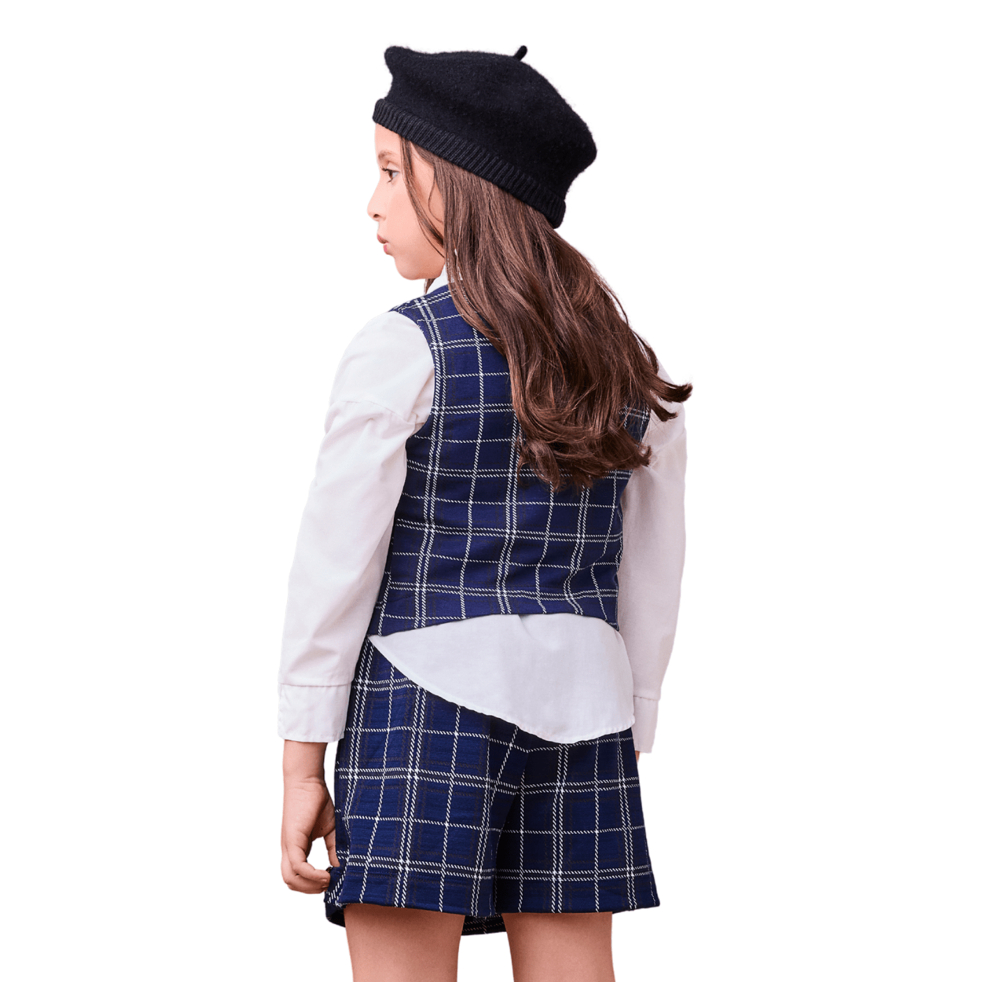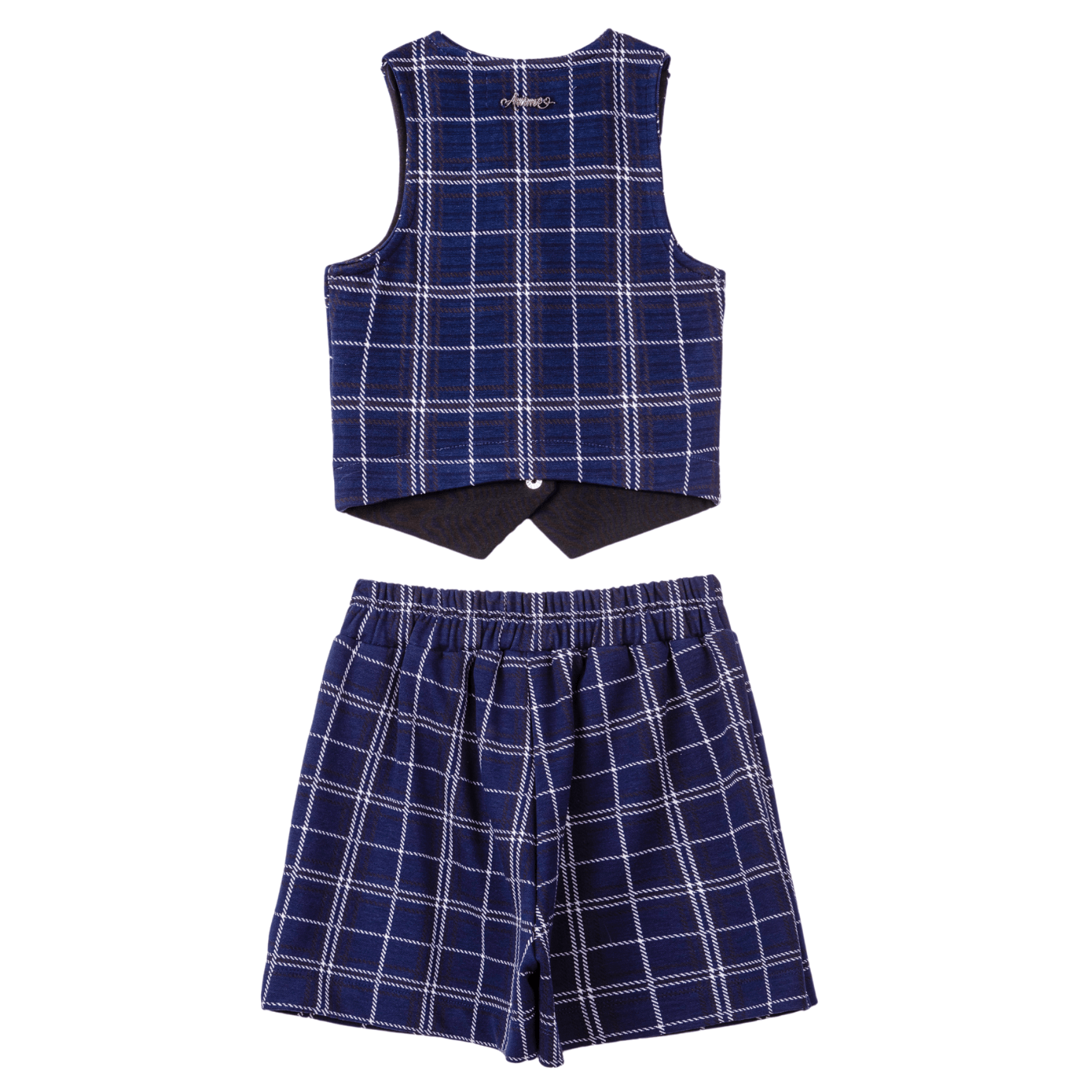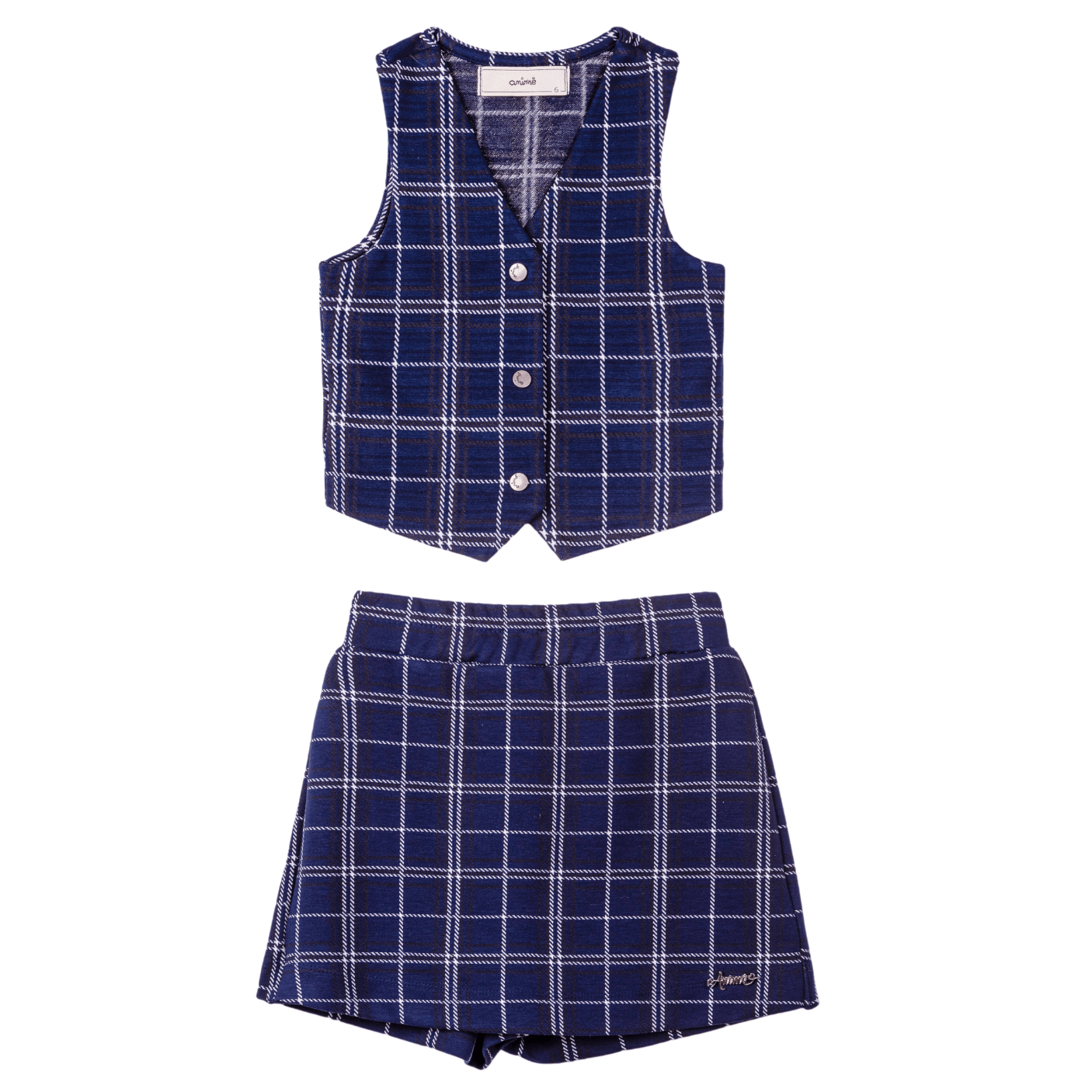 Composto por um colete estiloso e uma saia clássica, ambos confeccionados em uma estampa xadrez azul-marinho atemporal, o conjunto se destaca pela harmonia entre tradição e tendências atuais. O colete, com sua modelagem moderna e recorte impecável, traz botões delicados que acrescentam um ar de sofisticação e cuidado aos mínimos detalhes. Ele pode ser usado fechado para uma proposta mais elegante ou aberto, combinado com uma blusa por baixo, criando um look fashionista e versátil.