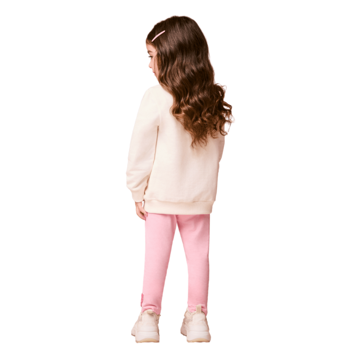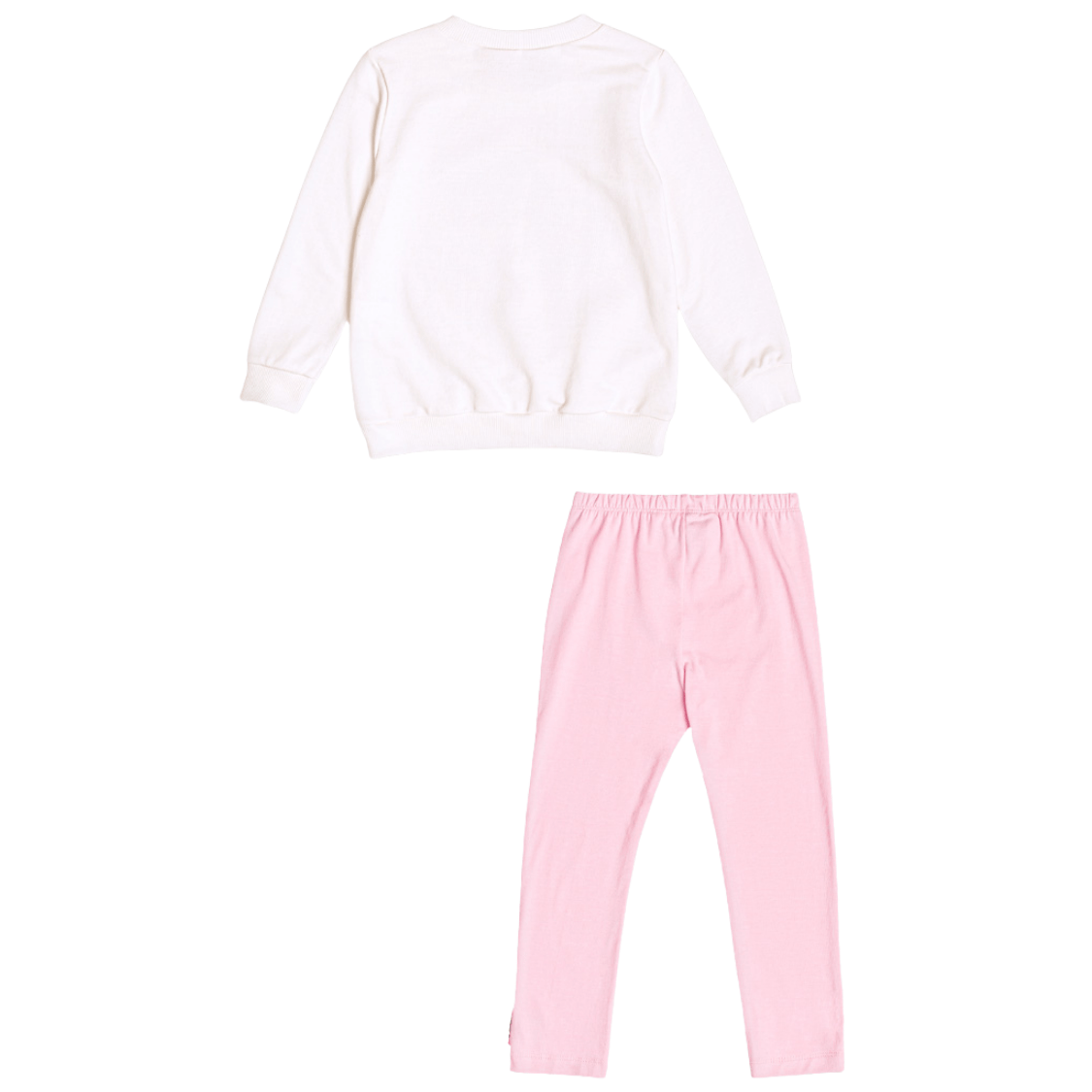 A blusa possui modelagem confortável com estampa frontal divertida e delicada, enquanto a legging em tom rosa suave complementa o look com charme e praticidade.
