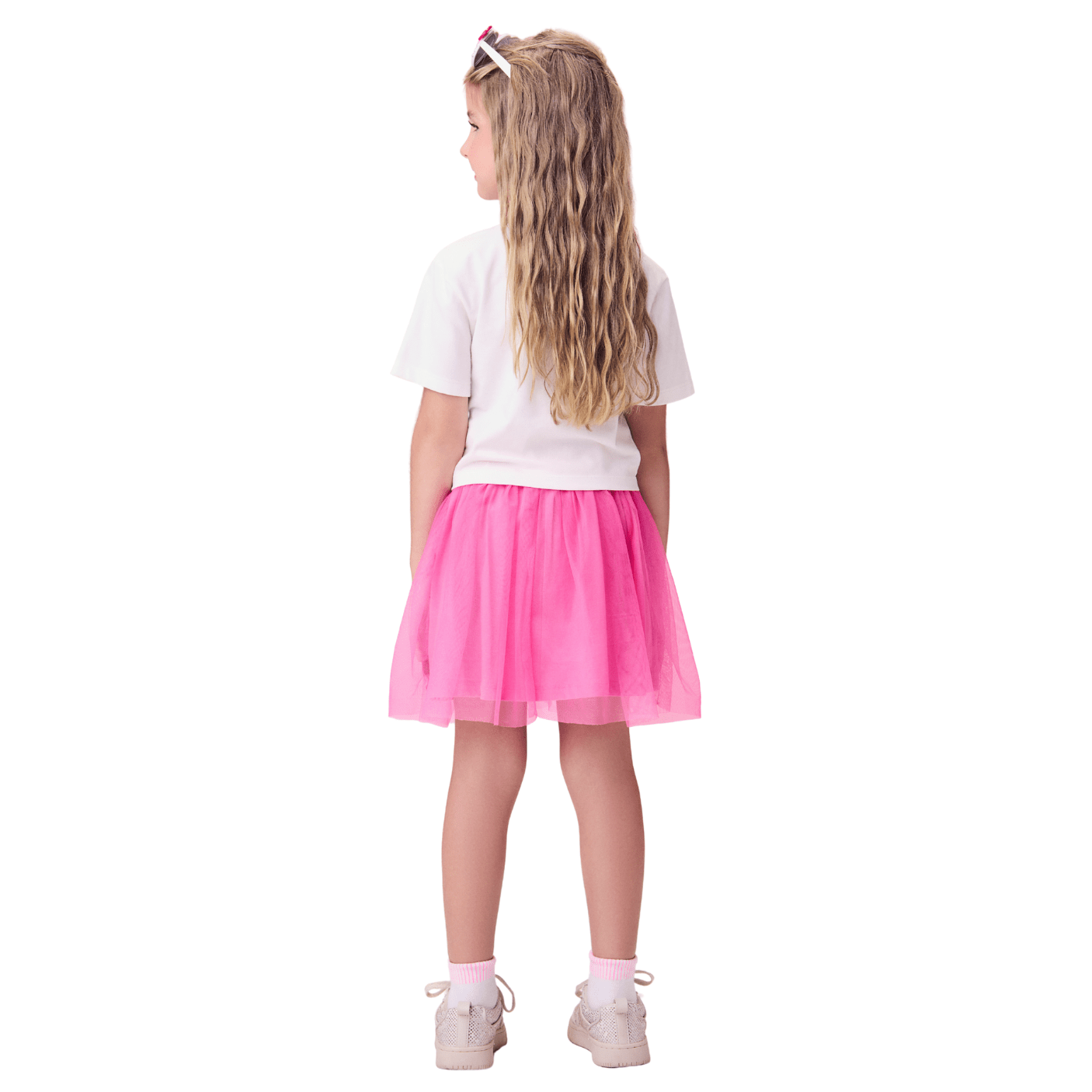 A blusa em malha macia traz estampa fofa da Hello Kitty com seus amigos, garantindo um toque divertido e cheio de personalidade. Já a saia com camada de tule pink sobreposta cria um efeito leve e encantador, adicionando movimento e brilho ao look. A cintura com elástico garante ajuste confortável e liberdade para brincar à vontade.