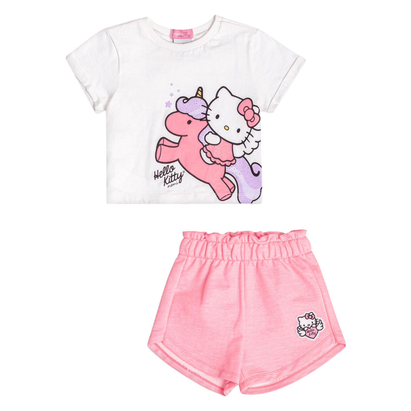 O Conjunto Hello Kitty Unicórnio Cute Momi é pura fofura e encanto para as pequenas que amam a magia da infância. Composto por uma blusa e um short super confortável, o look traz toda a alegria e o carisma da Hello Kitty em uma versão lúdica e divertida.