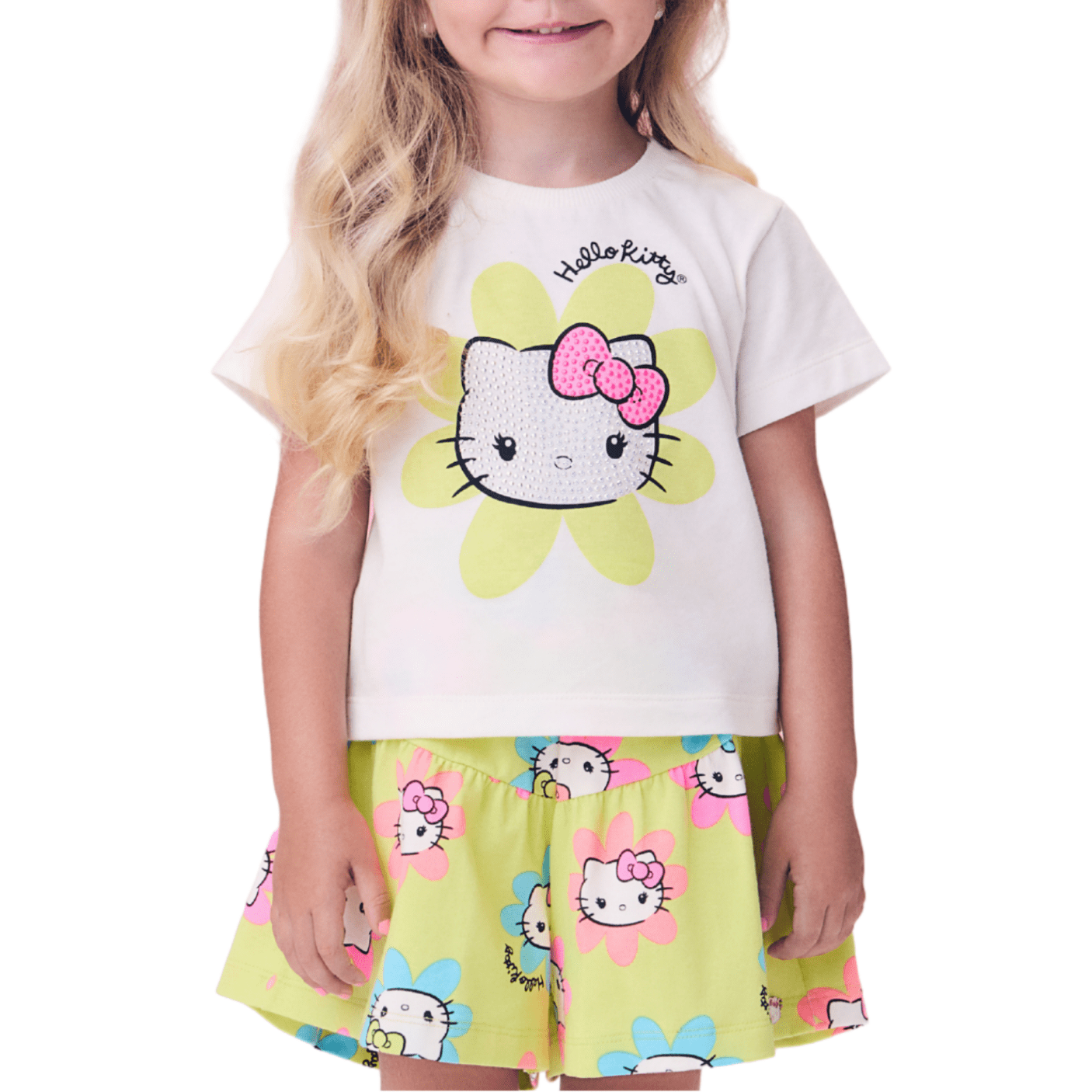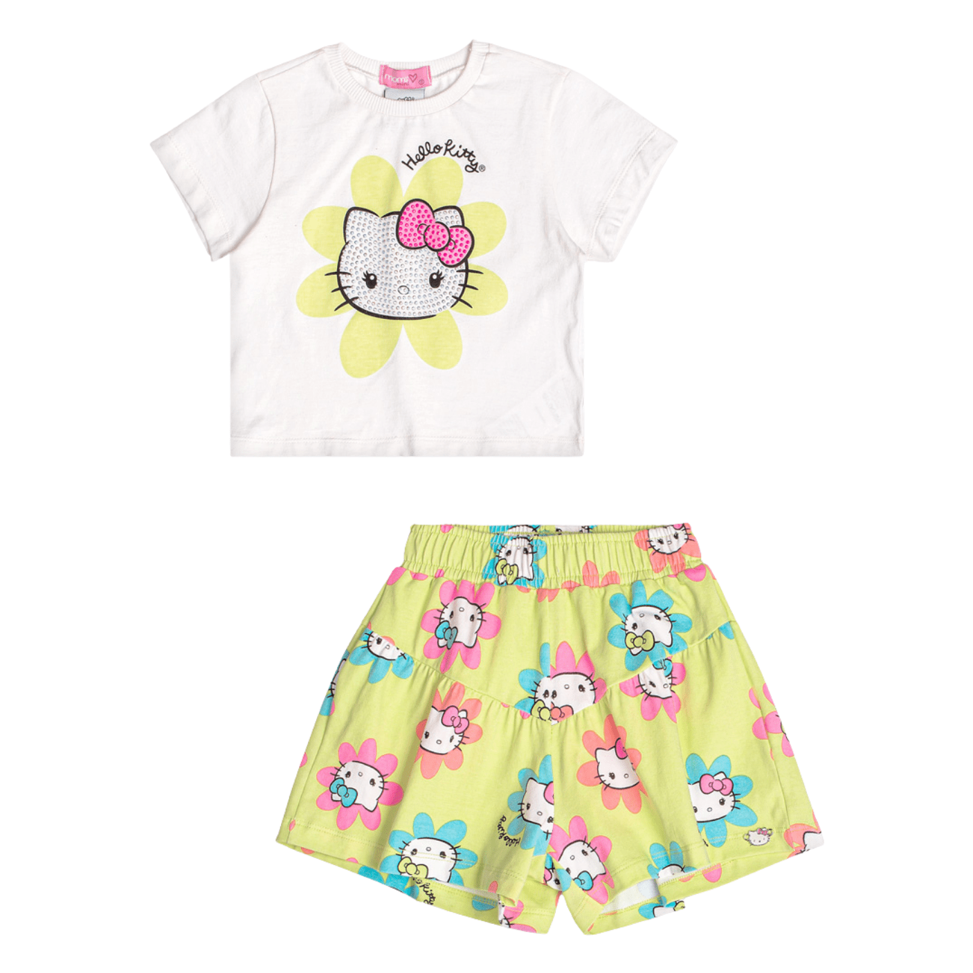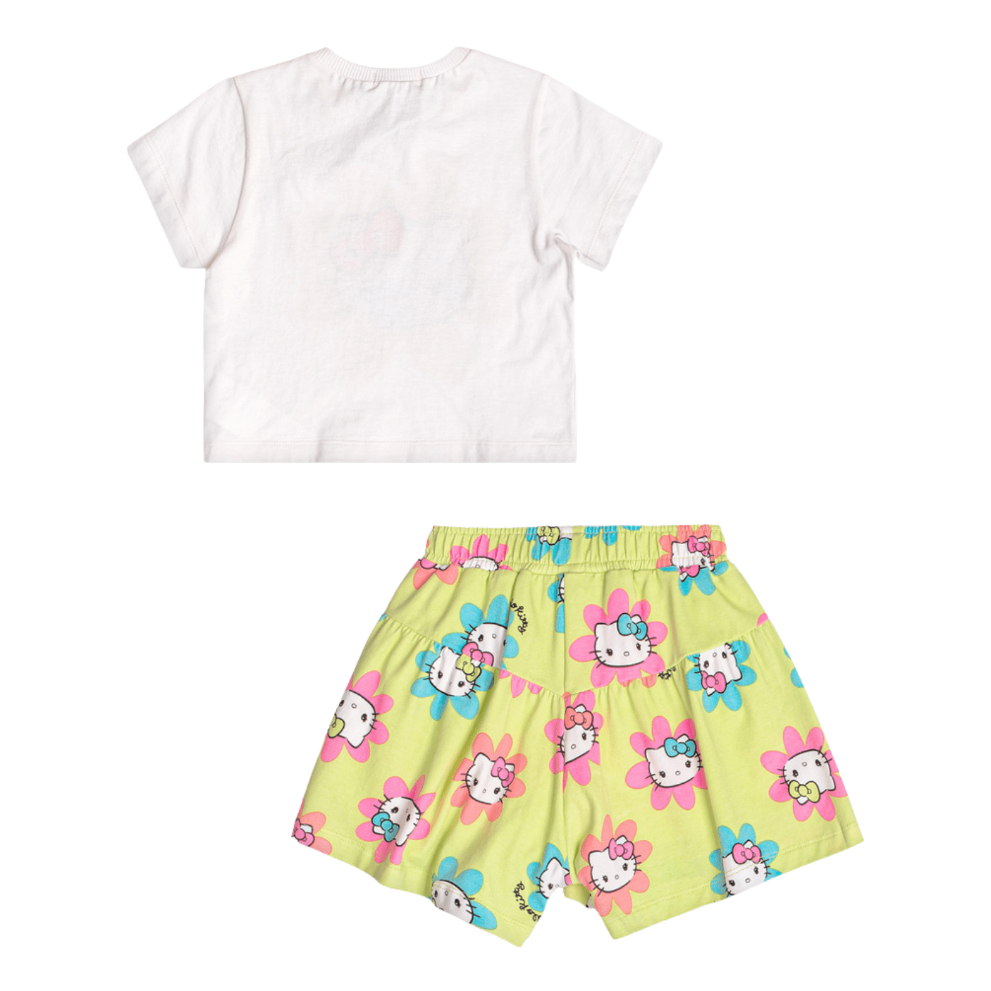 O Conjunto Leve Hello Kitty Flores Verde Momi é pura delicadeza e alegria! Composto por uma blusa branca com estampa exclusiva da Hello Kitty e um shorts verde estampado com flores coloridas, ele é perfeito para acompanhar as pequenas em momentos cheios de diversão e conforto.