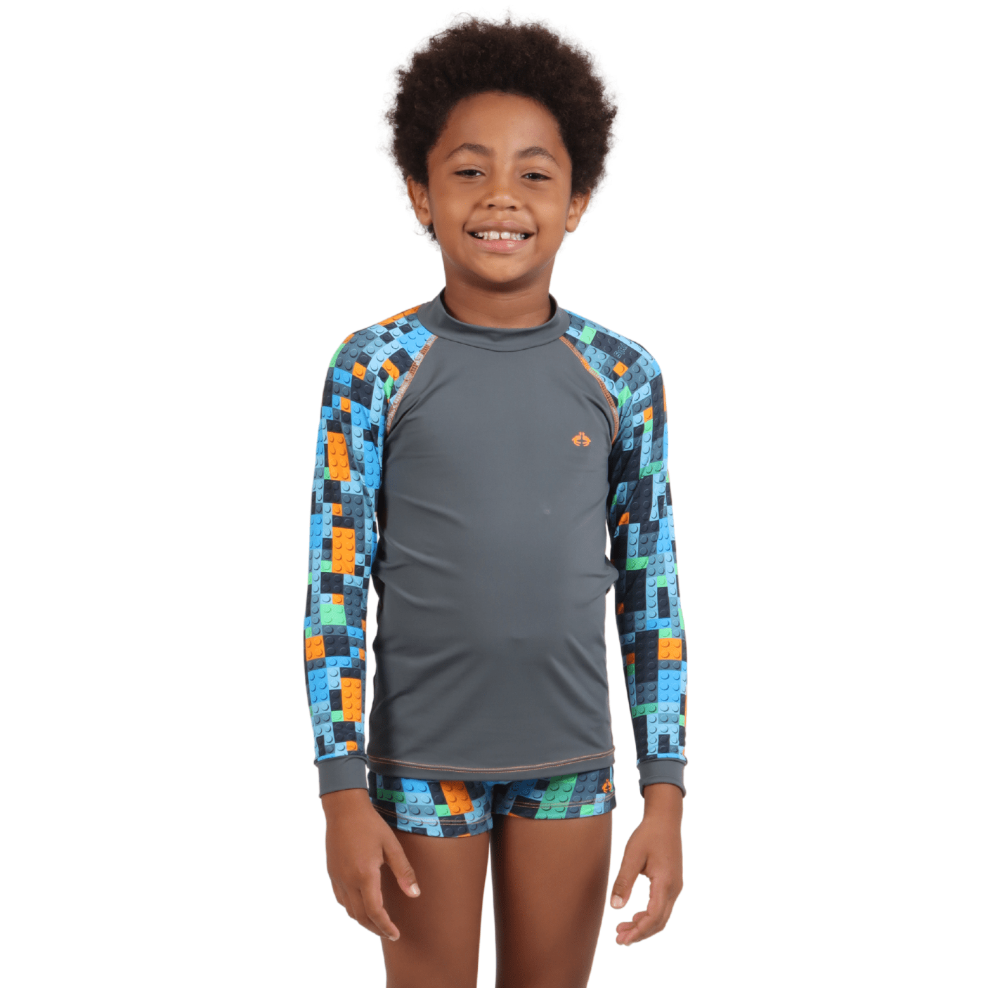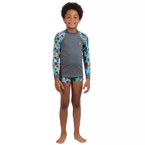 A blusa possui design em tom chumbo com mangas estampadas em blocos coloridos, combinando estilo e funcionalidade, enquanto a sunga mantém o mesmo padrão divertido para um visual coordenado. As costuras reforçadas aumentam a durabilidade da peça, tornando-a ideal para acompanhar os pequenos em todas as aventuras.
