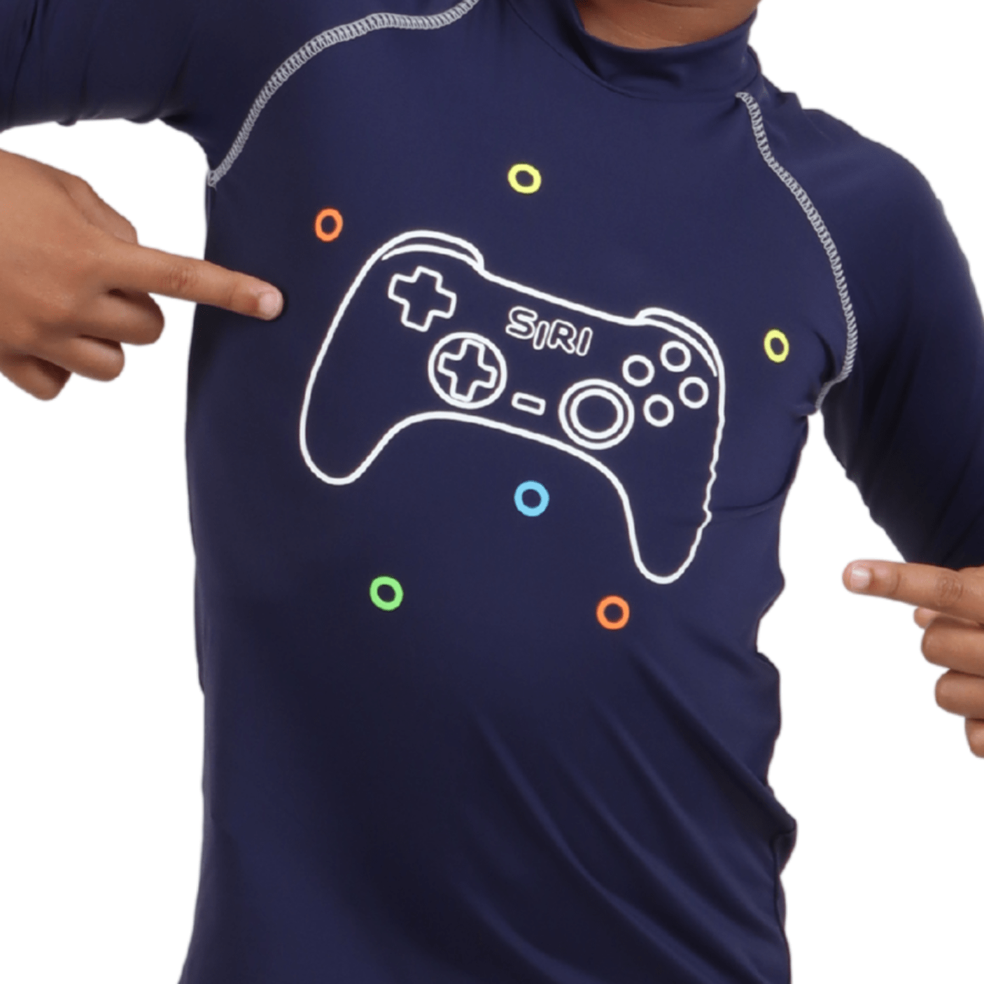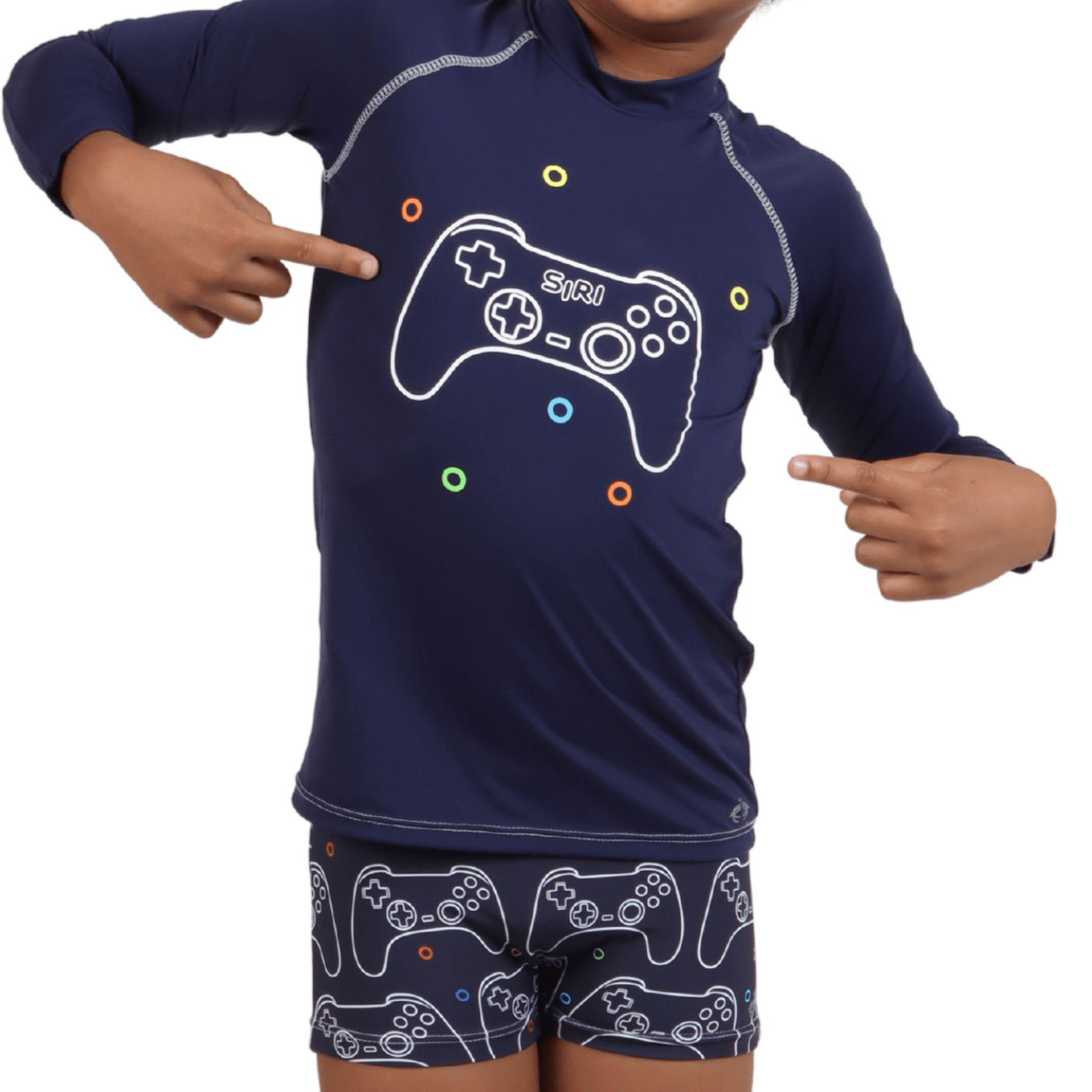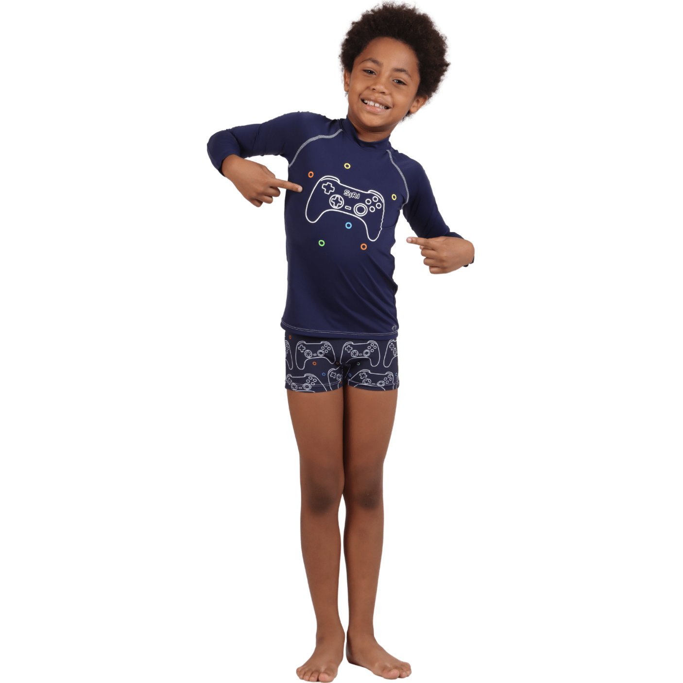 Composto por camiseta de manga longa com proteção solar e sunga boxer estampada, o conjunto foi desenvolvido em tecido tecnológico com toque macio, alta elasticidade e secagem rápida, proporcionando liberdade de movimentos e muito conforto durante as brincadeiras na praia ou piscina.