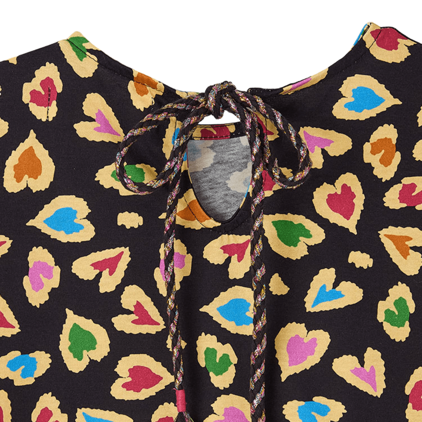 A combinação moderna de cores vibrantes com o fundo escuro cria um visual divertido e cheio de personalidade — perfeito para meninas que adoram expressar alegria através das roupas. Ideal para o dia a dia, passeios ou momentos de lazer com muito estilo.