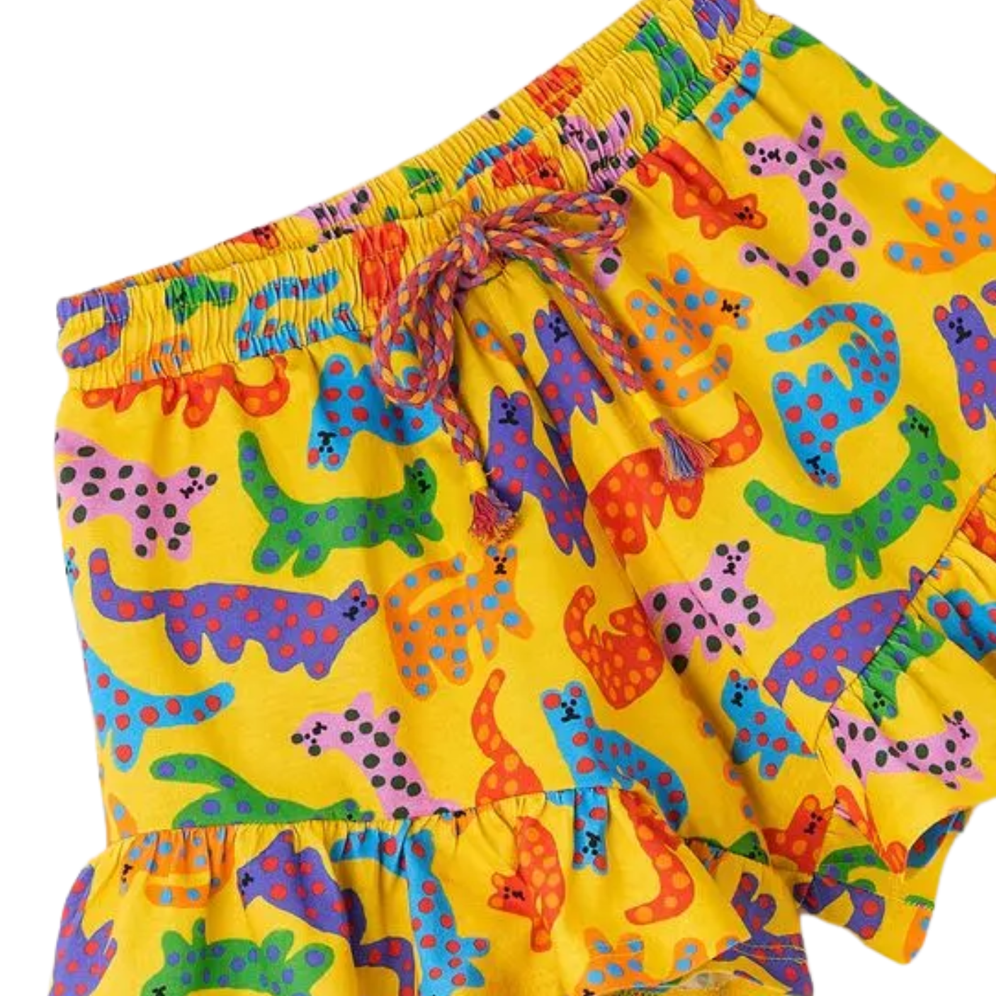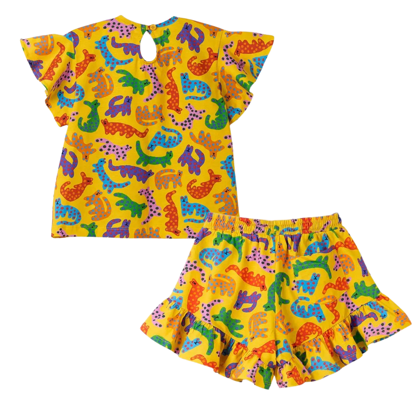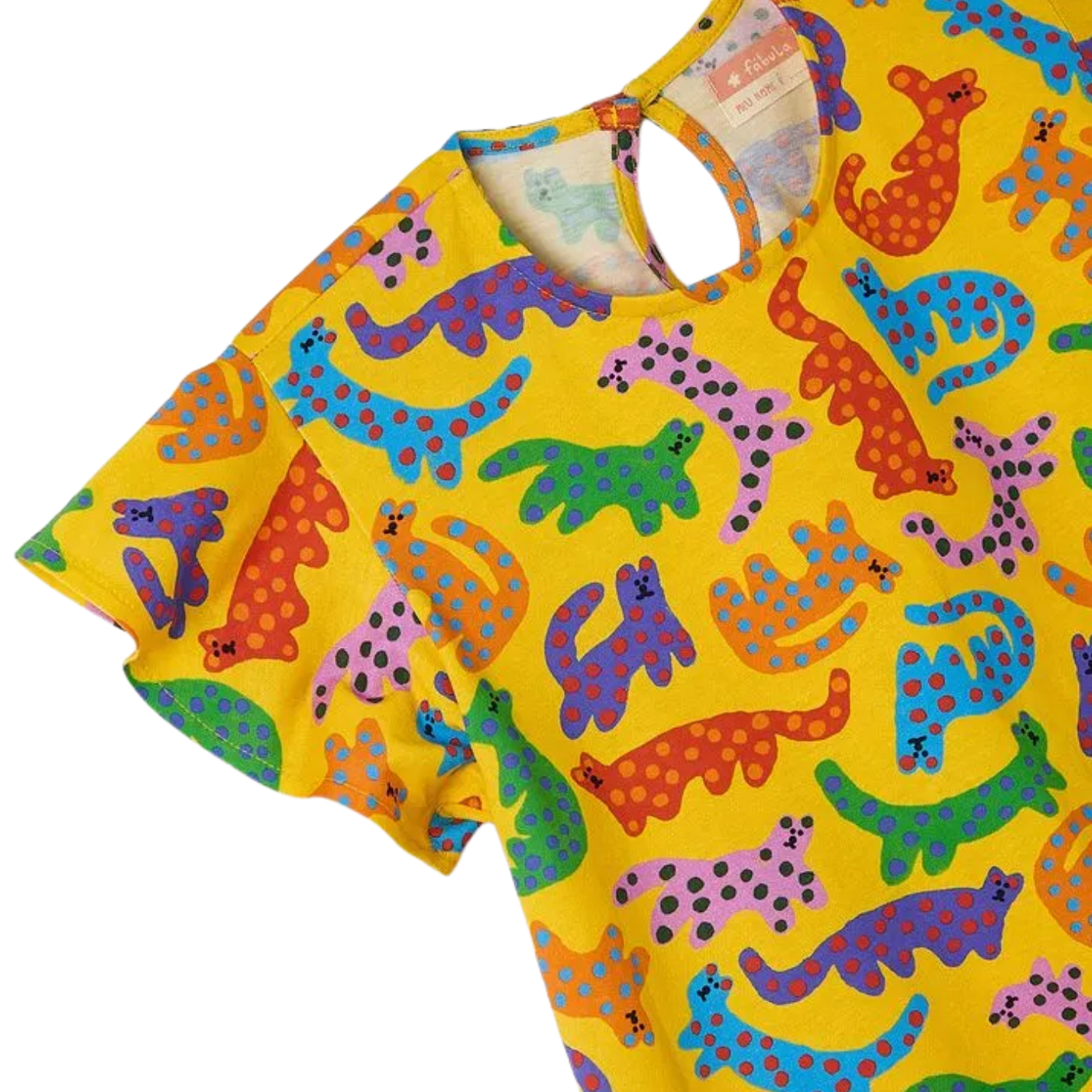 O fundo amarelo solar e as cores contrastantes da estampa tornam o look encantador e cheio de energia — perfeito para dias de verão, passeios em família e momentos de brincadeira com muito estilo.