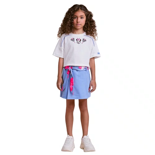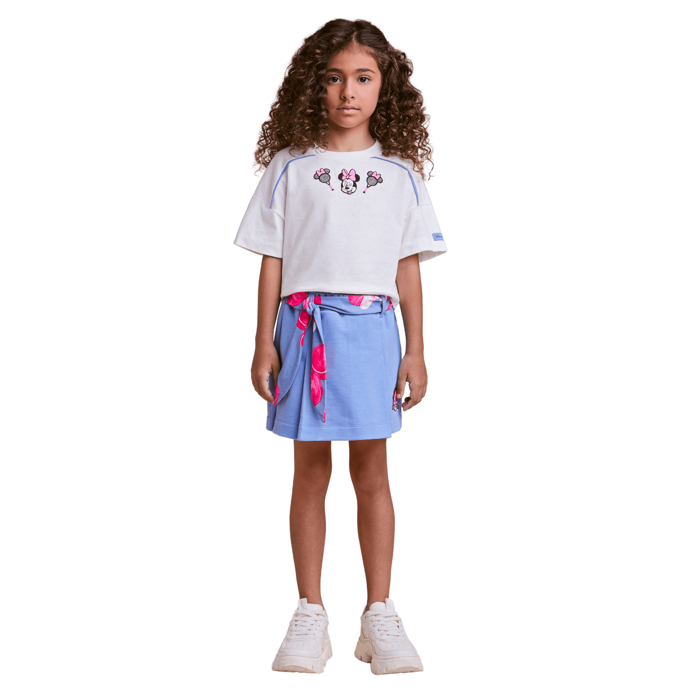 A blusa branca apresenta modelagem cropped soltinha, mangas curtas amplas e gola redonda, com estampa delicada da Minnie acompanhada de raquetes de tênis, trazendo uma proposta esportiva e divertida. Já a parte inferior é composta por uma saia azul com estampa floral em rosa vibrante, além de detalhe de faixa para amarração na cintura, que valoriza a silhueta e adiciona charme ao visual.