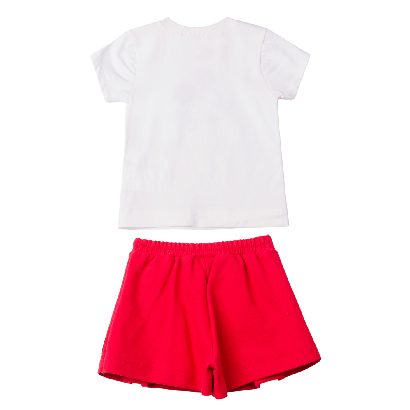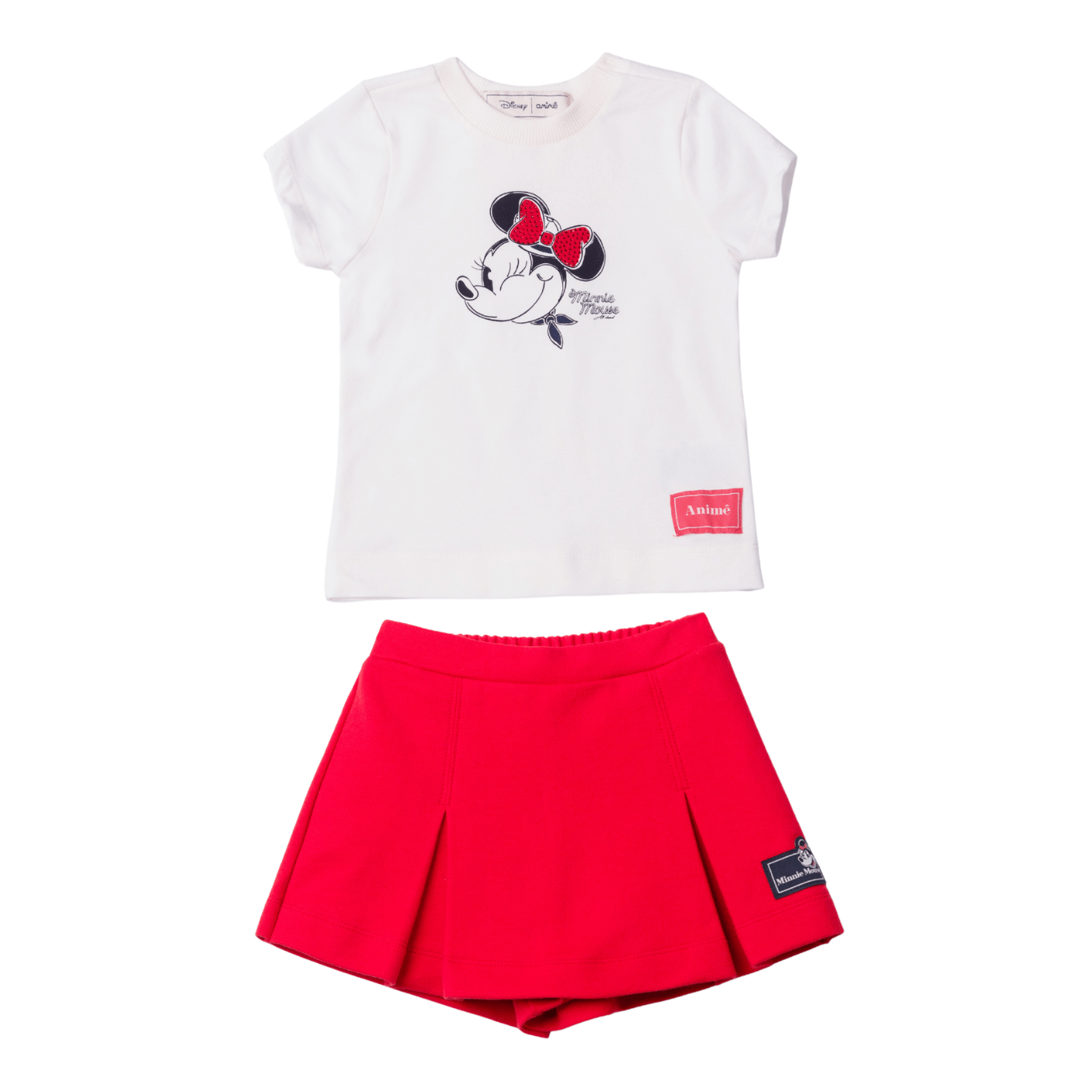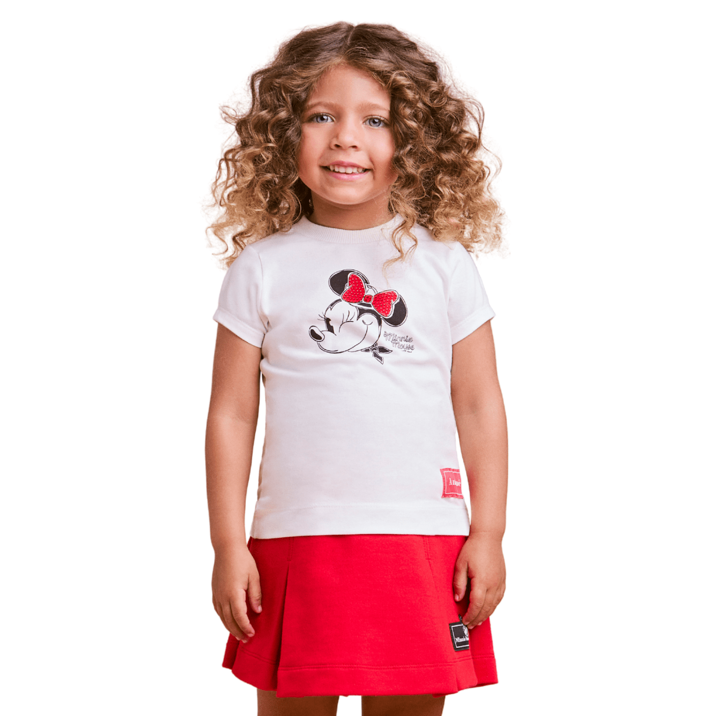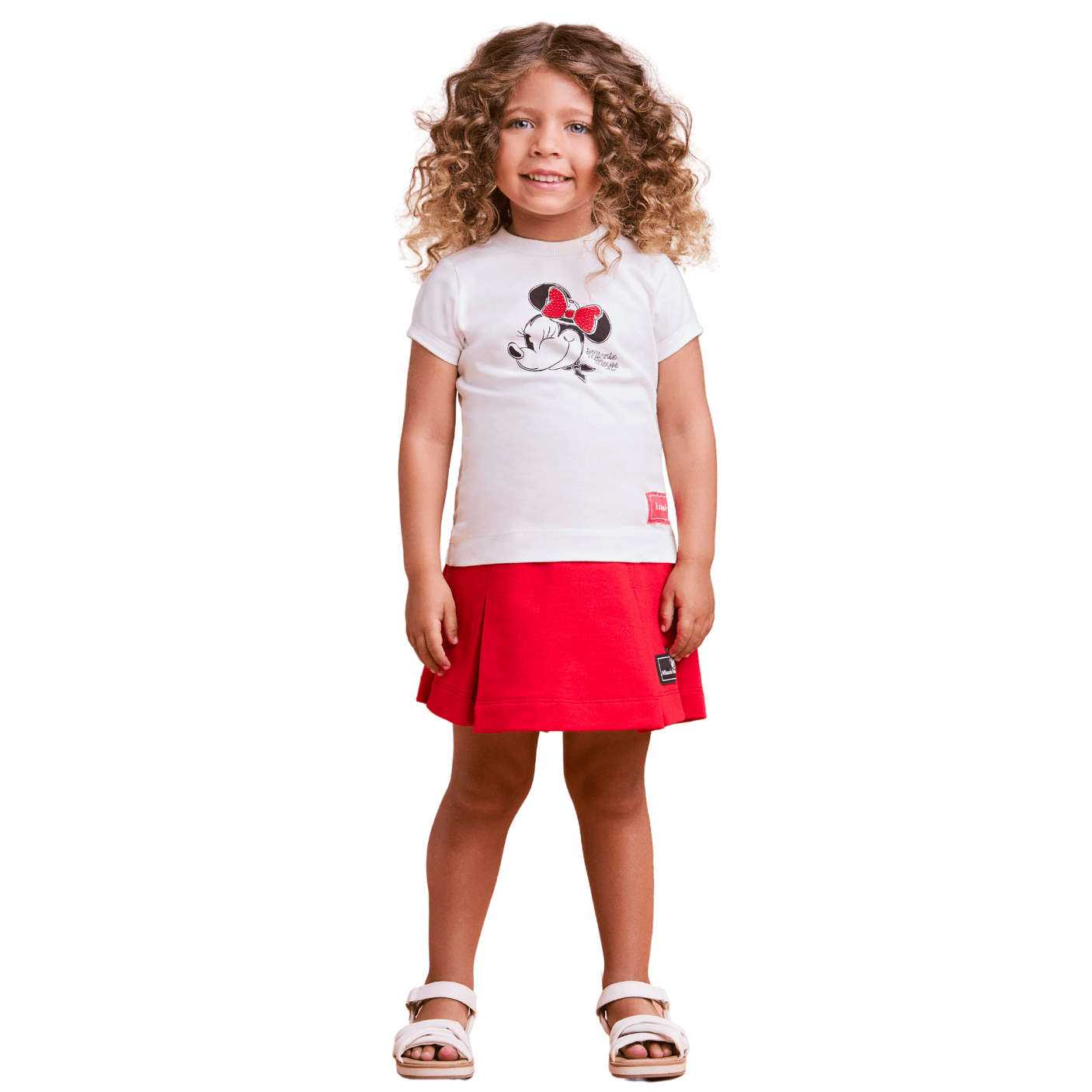 A blusa branca apresenta a estampa delicada da Minnie, adicionando um toque divertido e encantador, que faz sucesso em qualquer ocasião. O shorts vermelho completa o visual com modernidade e caimento confortável, além de ser uma peça versátil que combina facilmente com outras roupas do dia a dia.