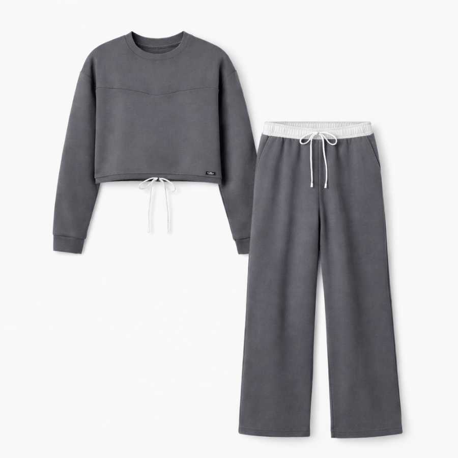 Com modelagem confortável e caimento impecável, o conjunto traz blusa de manga longa e calça com ajuste na cintura, criando uma proposta minimalista e sofisticada. O tom grafite é elegante, versátil e atemporal — ideal para quem busca um look comfy sem abrir mão do estilo.