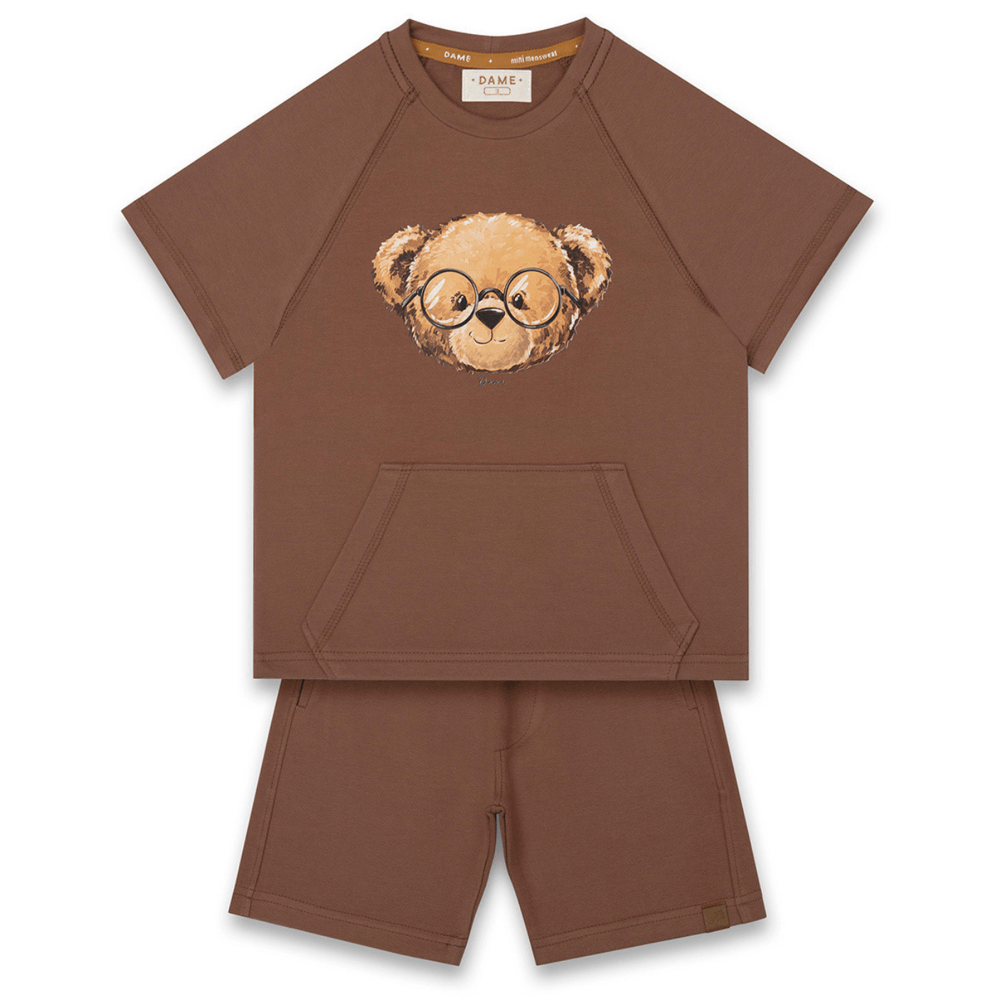 A camiseta possui modelagem moderna, mangas curtas e bolso canguru frontal, além da charmosa estampa do urso Teddy com óculos, que traz um ar divertido e encantador ao look. O short acompanha a proposta de conforto, com cós elástico para melhor ajuste e caimento, tornando o vestir prático e funcional.