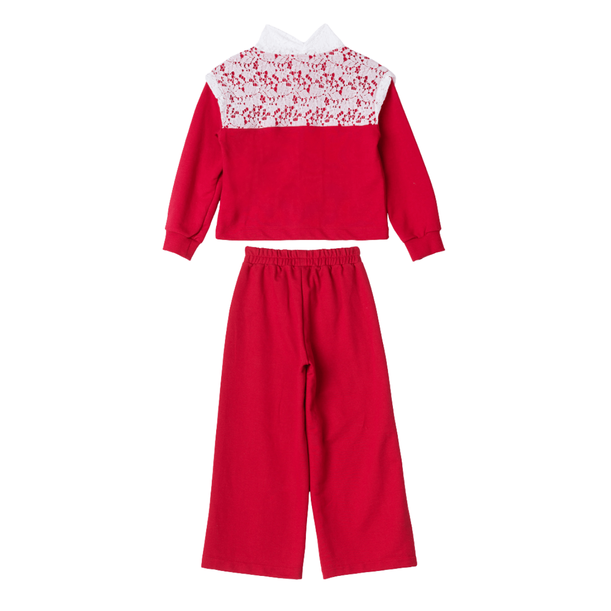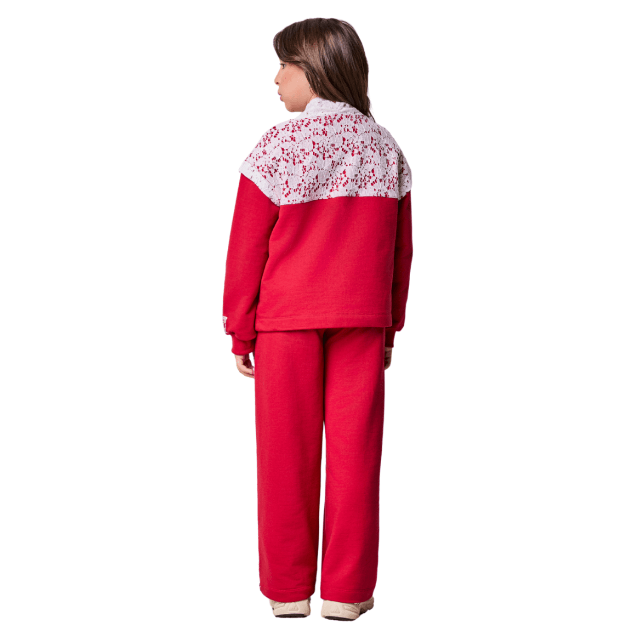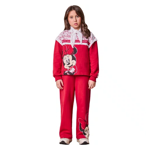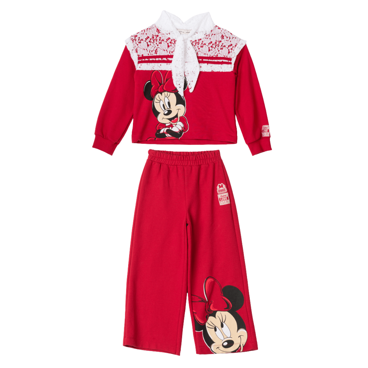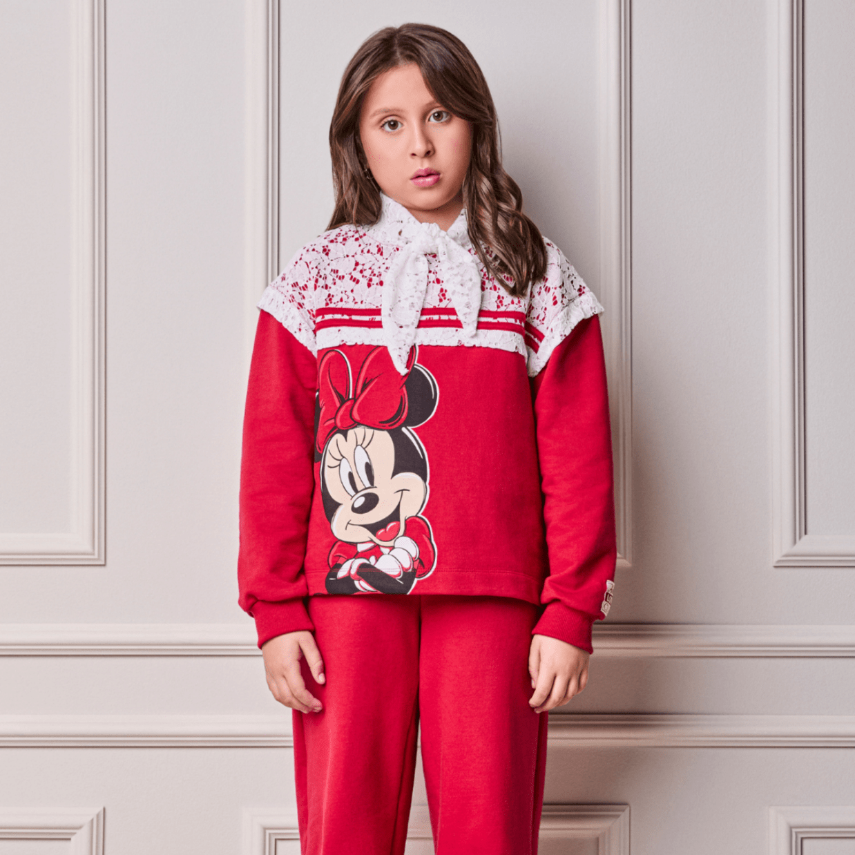 Confeccionado em moletom macio e aconchegante, o conjunto é ideal para dias mais fresquinhos, garantindo conforto e liberdade de movimento. A blusa possui estampa frontal da Minnie e um lindo detalhe em renda na parte superior, que adiciona um toque romântico e sofisticado.