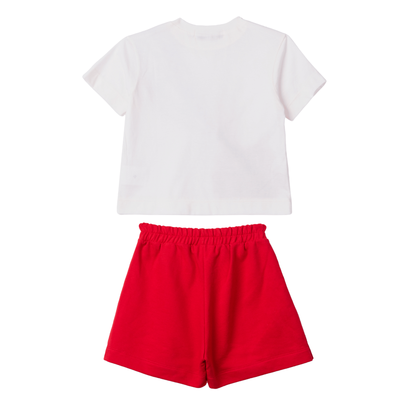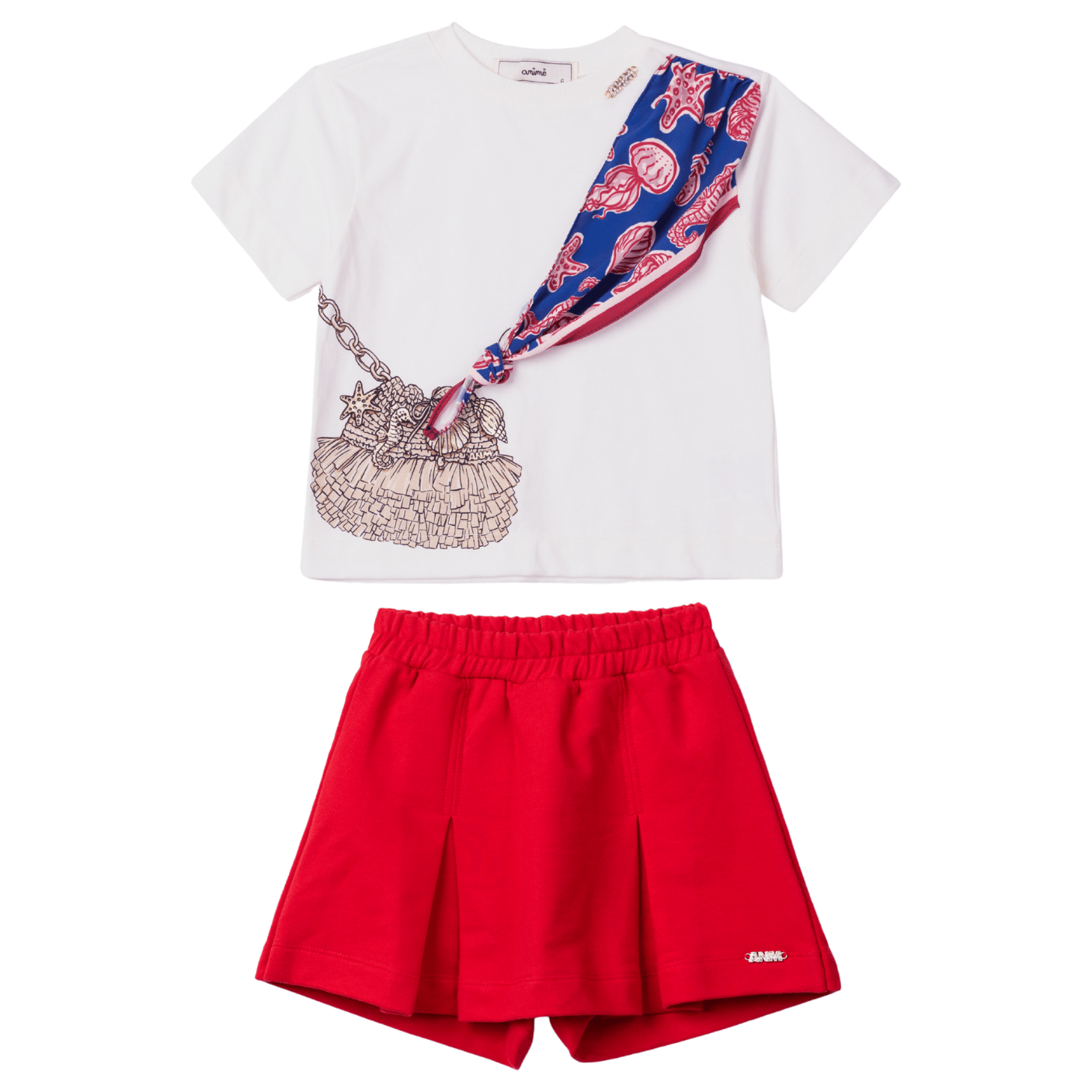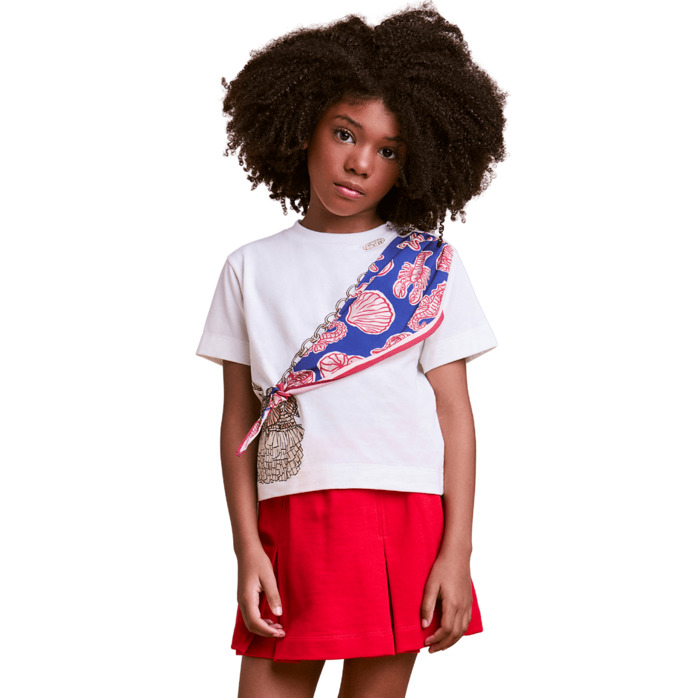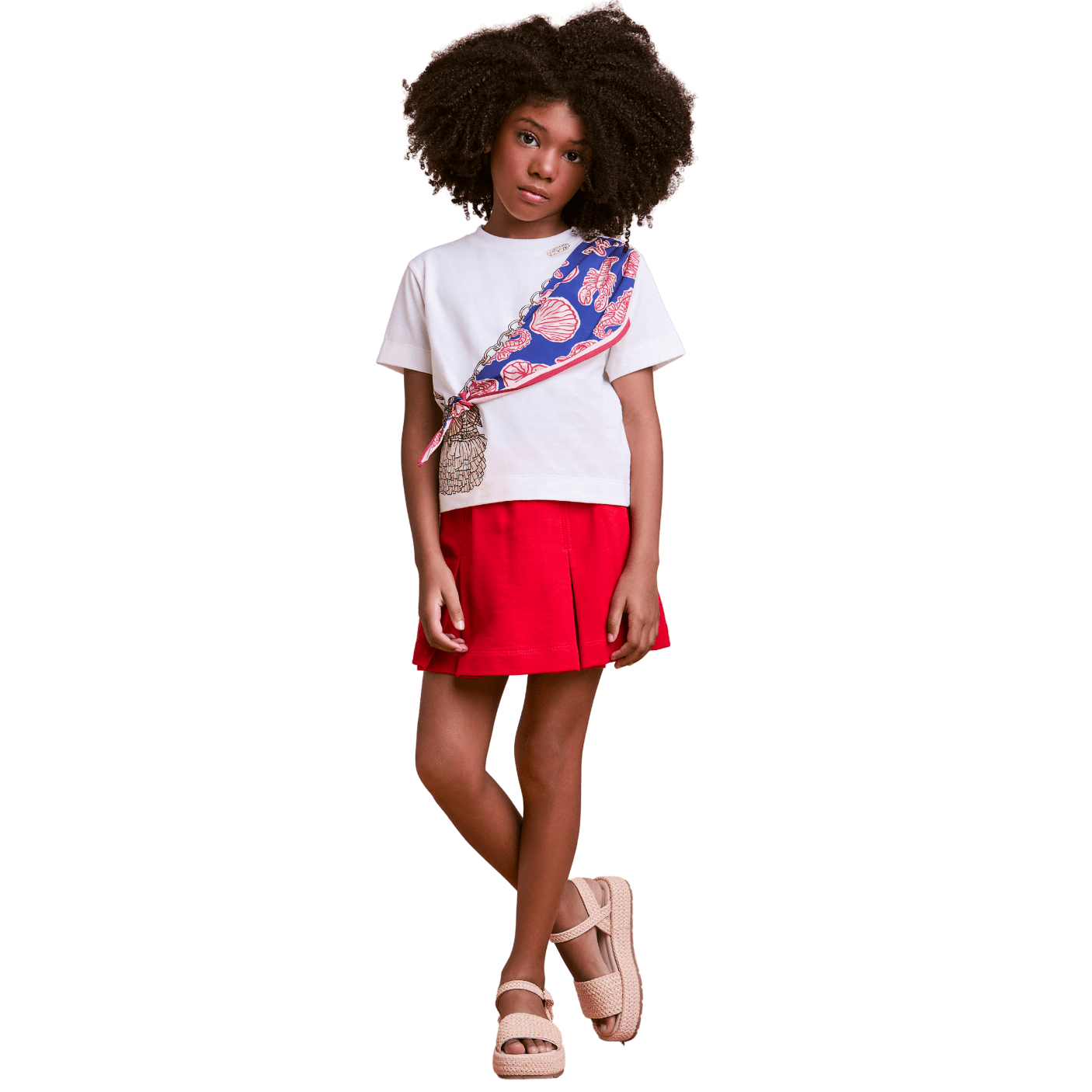 A blusa branca de modelagem soltinha ganha destaque com a aplicação da faixa estampada inspirada no fundo do mar, trazendo conchas, elementos náuticos e cores vibrantes que tornam o look divertido e atual. A saia/shorts em tom vermelho completa a produção com um toque navy clássico, resultando em uma composição versátil para diferentes ocasiões, do passeio casual às celebrações especiais.