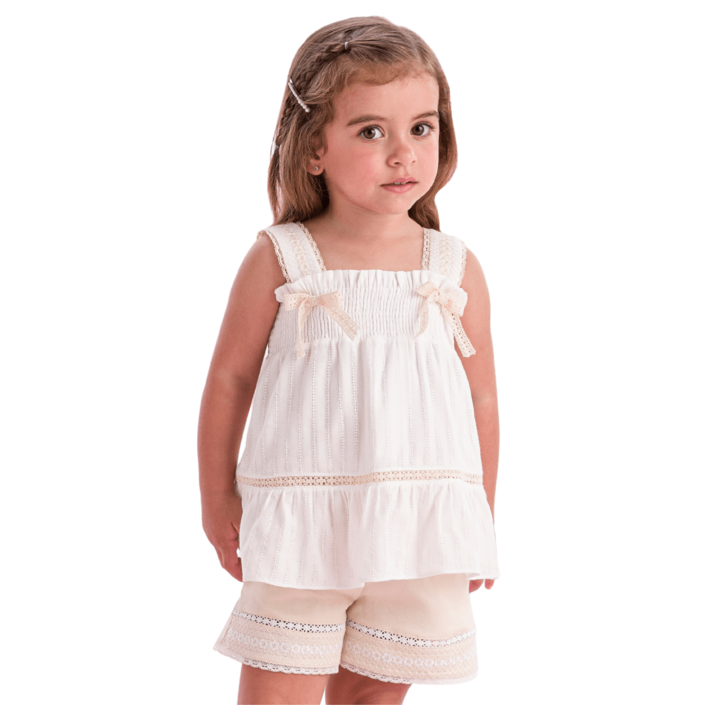 O Conjunto Off White Bege Bordado Delicado Petit Cherie é uma verdadeira joia da moda infantil, perfeito para ocasiões especiais e dias em que o conforto e a elegância caminham juntos. Sua combinação de tons suaves e detalhes românticos traduzem todo o encanto característico da marca.
