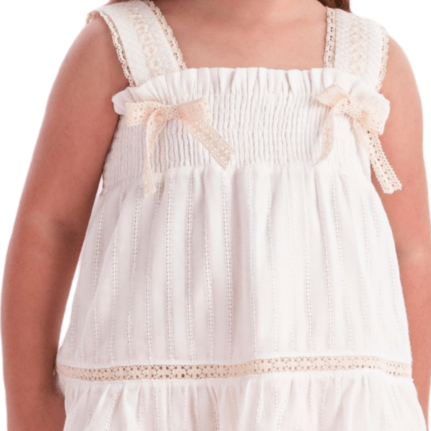 A blusa apresenta alcinhas largas com delicados laços e detalhes em renda, além de um leve franzido no busto que proporciona caimento solto e gracioso. O short acompanha o mesmo padrão refinado, com acabamento em barrado rendado e bordados sutis, criando um visual harmônico e encantador.