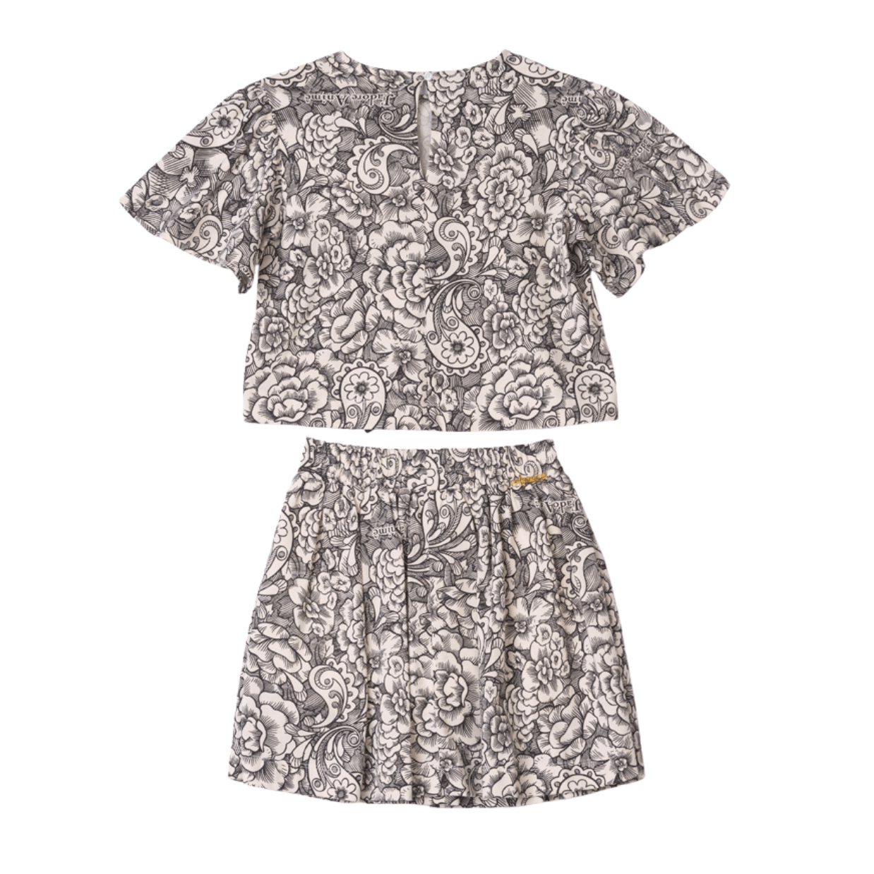 A saia complementa a produção com modelagem levemente rodada, criando movimento e leveza, além de manter a harmonia com a estampa.
