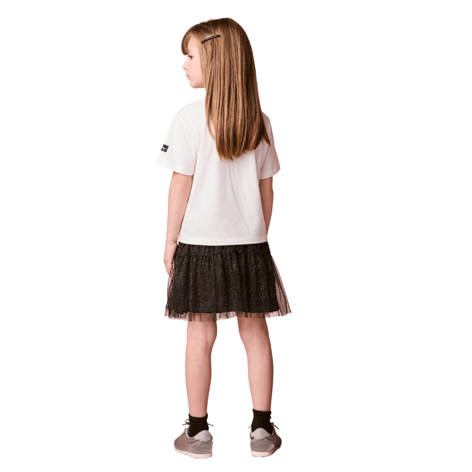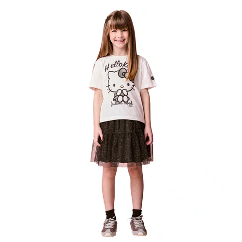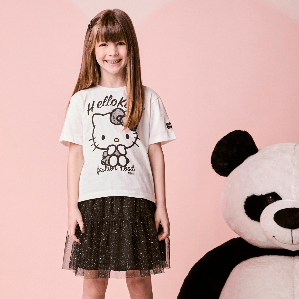 A camiseta com estampa exclusiva da Hello Kitty traz um visual moderno e cheio de personalidade. Já a saia de tule preta com brilho adiciona movimento, leveza e um toque glam ao look, criando uma produção encantadora e cheia de presença.