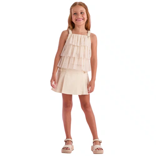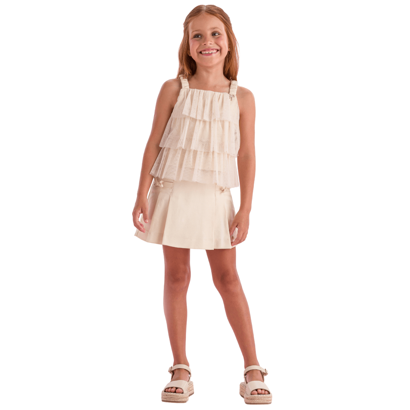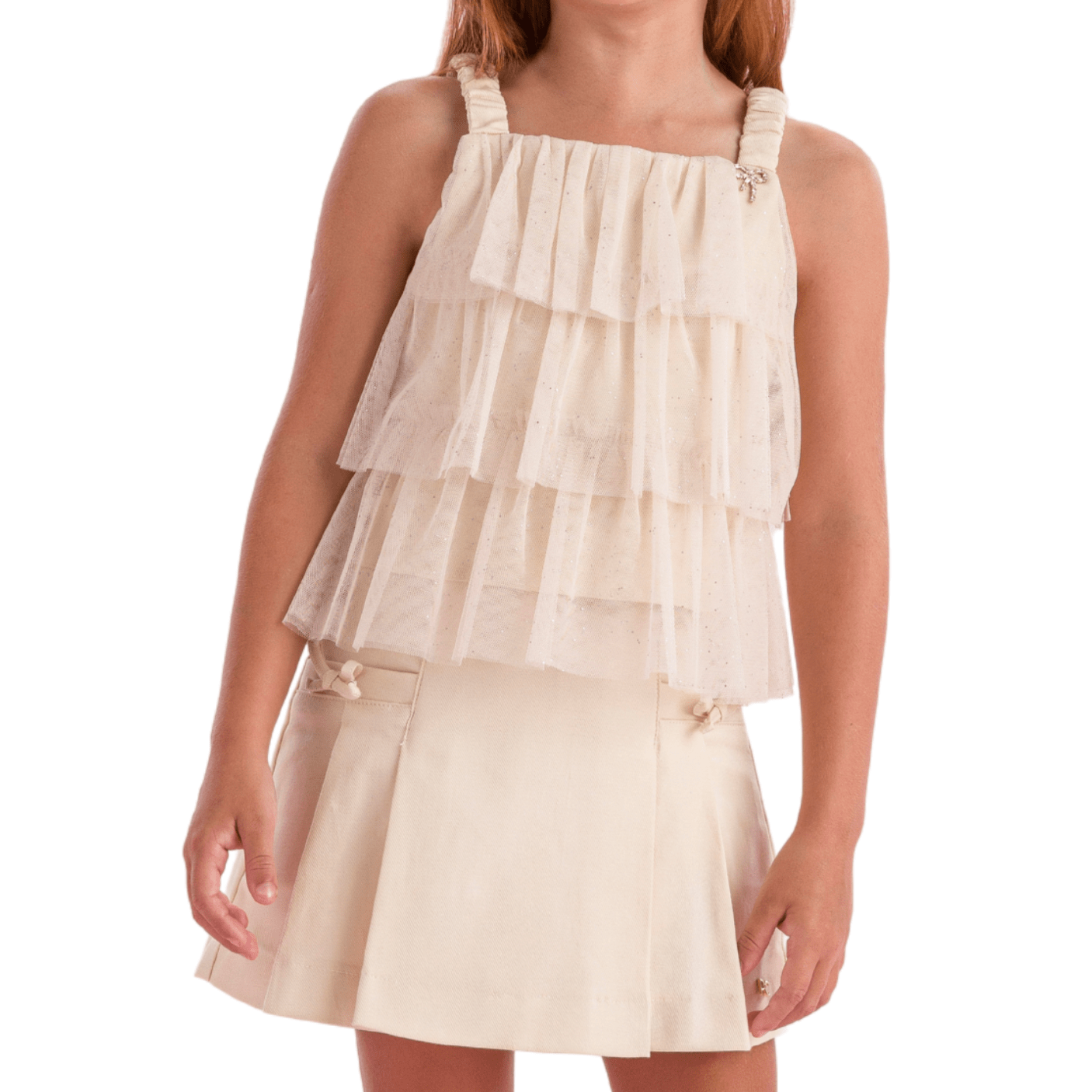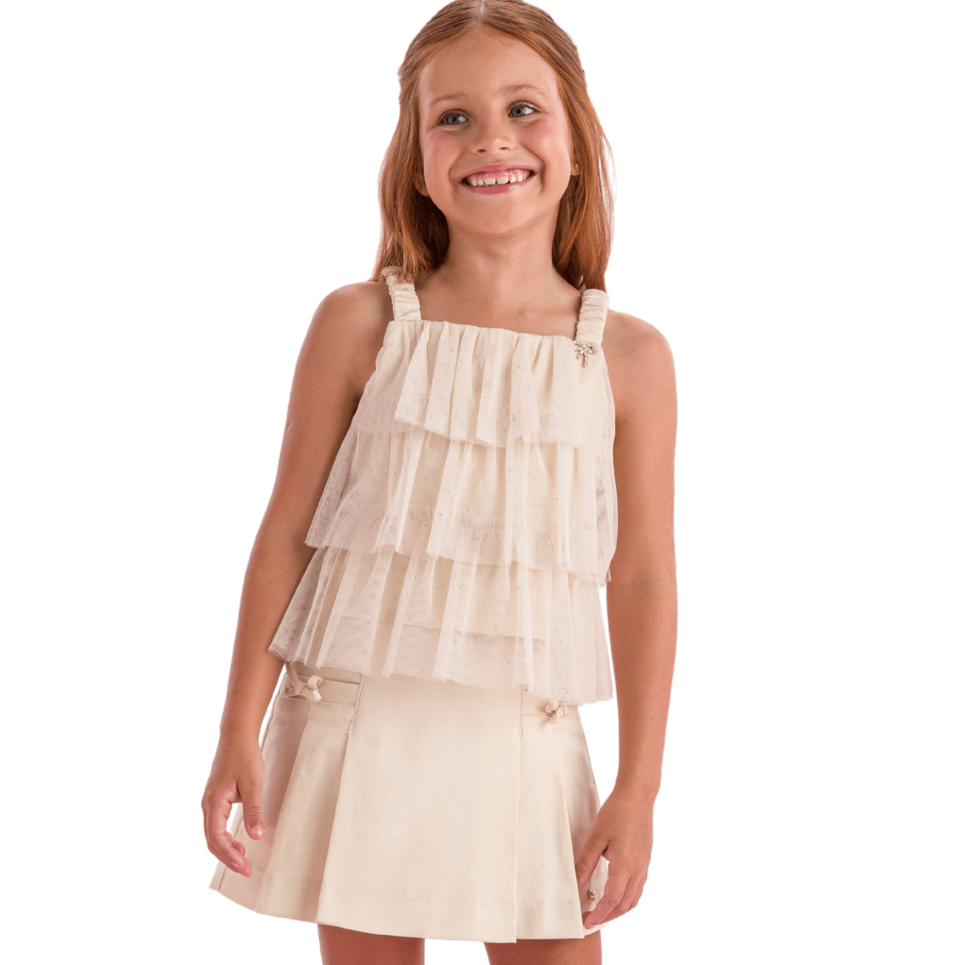 A saia, em tom bege clássico, possui pregas discretas que garantem caimento impecável e detalhes em lacinhos delicados na cintura, reforçando o estilo romântico da marca. Confortável e sofisticado, o conjunto é a escolha ideal para aniversários, eventos especiais, ensaios fotográficos ou momentos em família onde o estilo faz toda a diferença.