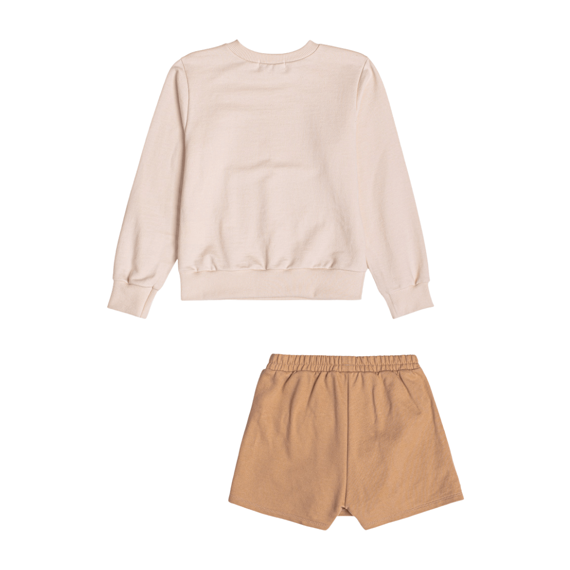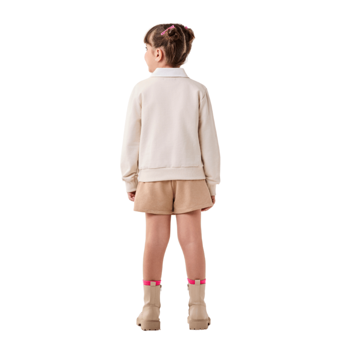 O blusão em tom bege/vanilla é confeccionado em tecido macio e aconchegante, com estampa divertida de animais que encanta e traz personalidade ao look. A saia shorts complementa o conjunto com muito estilo, garantindo liberdade de movimento com segurança e conforto, ideal para o dia a dia das pequenas.