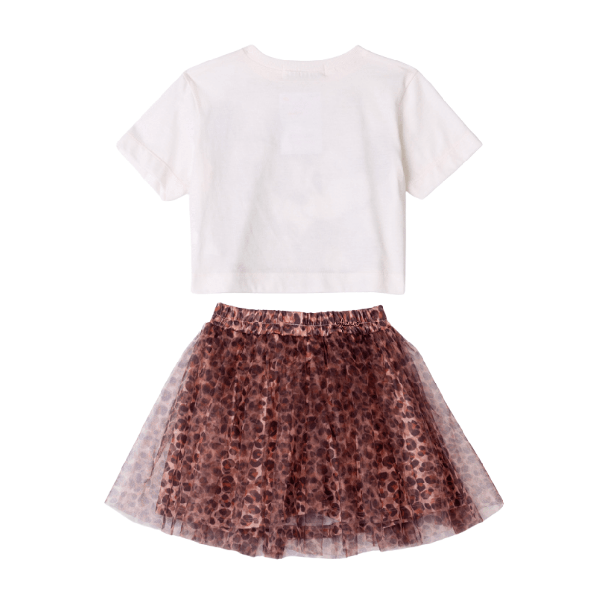 A saia em destaque é confeccionada em tule com estampa de oncinha, criando um efeito volumoso, leve e super estiloso. O cós confortável proporciona um ajuste perfeito, completando o look com praticidade.
