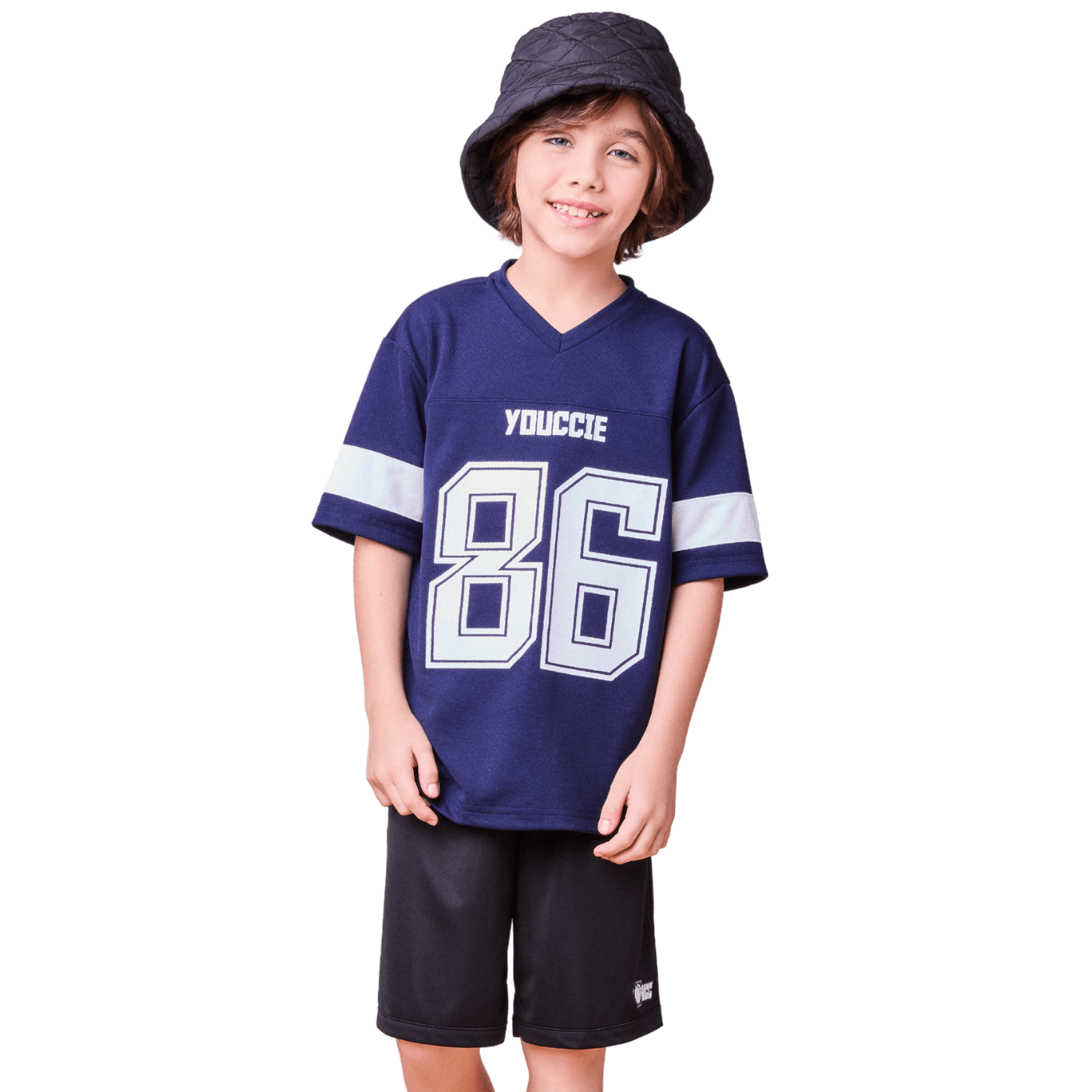 Inspirado nos clássicos uniformes esportivos americanos, este conjunto é a escolha perfeita para meninos cheios de energia e atitude. A camiseta de manga curta azul marinho destaca o número 86 na parte frontal, adicionando um toque autêntico e dinâmico ao visual. Seu tecido leve e macio garante frescor e liberdade de movimento, ideal para acompanhar qualquer aventura.