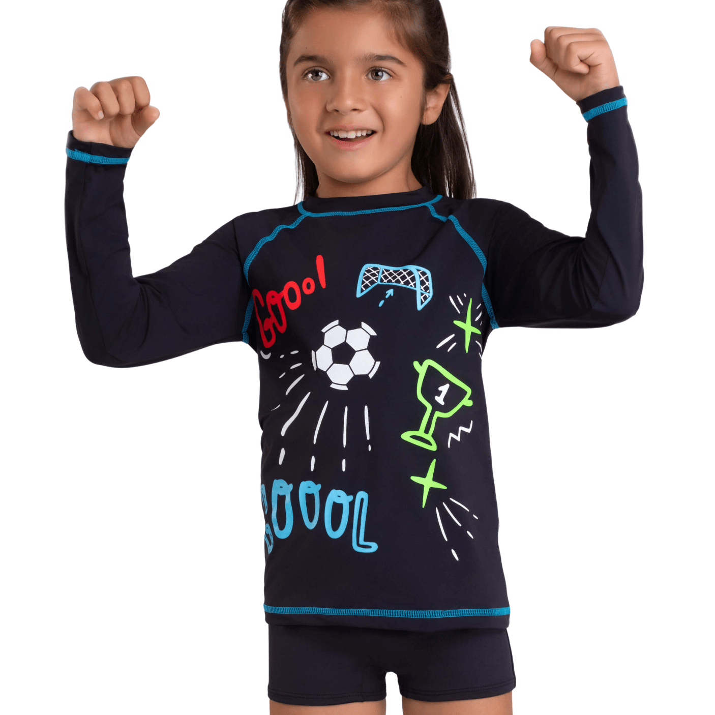 A camiseta de manga longa com proteção solar UV 50+ garante segurança contra os raios solares, ideal para praia, piscina ou brincadeiras ao ar livre. O tecido leve, elástico e de secagem rápida mantém o corpo fresco e confortável, mesmo após horas de diversão.