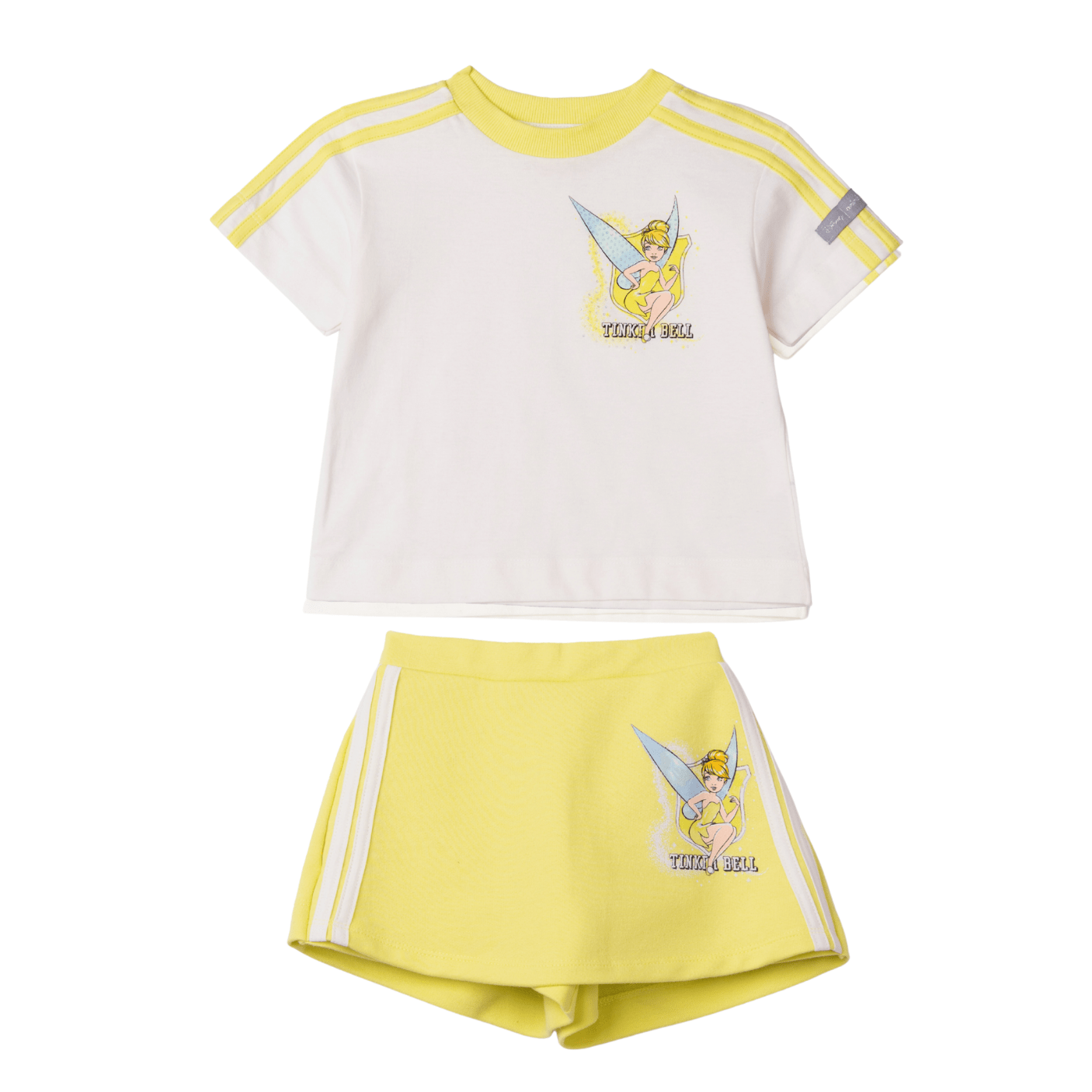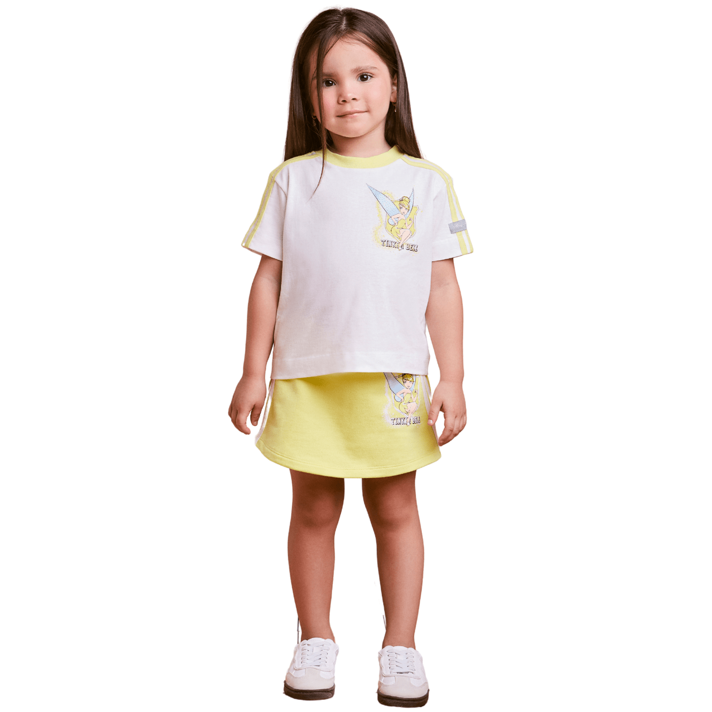 A saia, em tom verde suave, complementa o conjunto com caimento leve e confortável, sendo perfeita para brincar, passear ou compor looks mais arrumadinhos. O detalhe da estampa coordenada da Tinker Bell na barra cria harmonia entre as peças, tornando o conjunto ainda mais especial e cheio de personalidade.