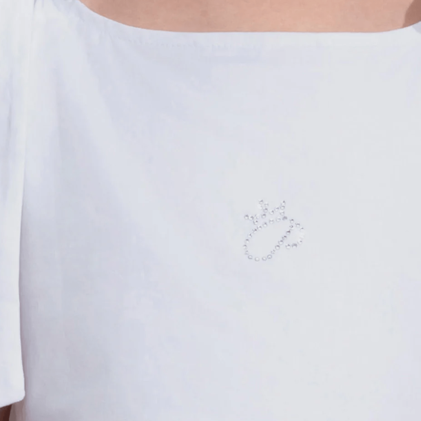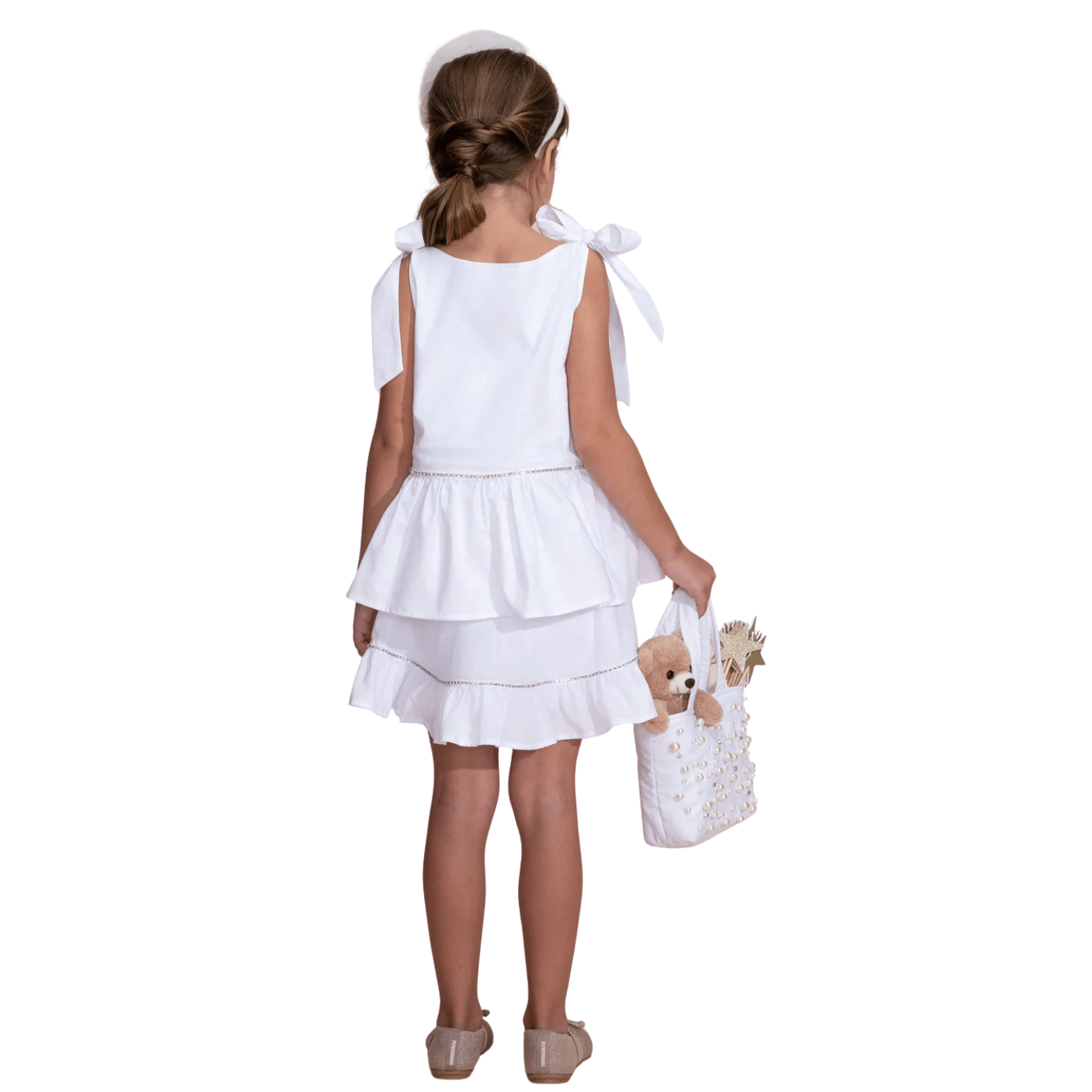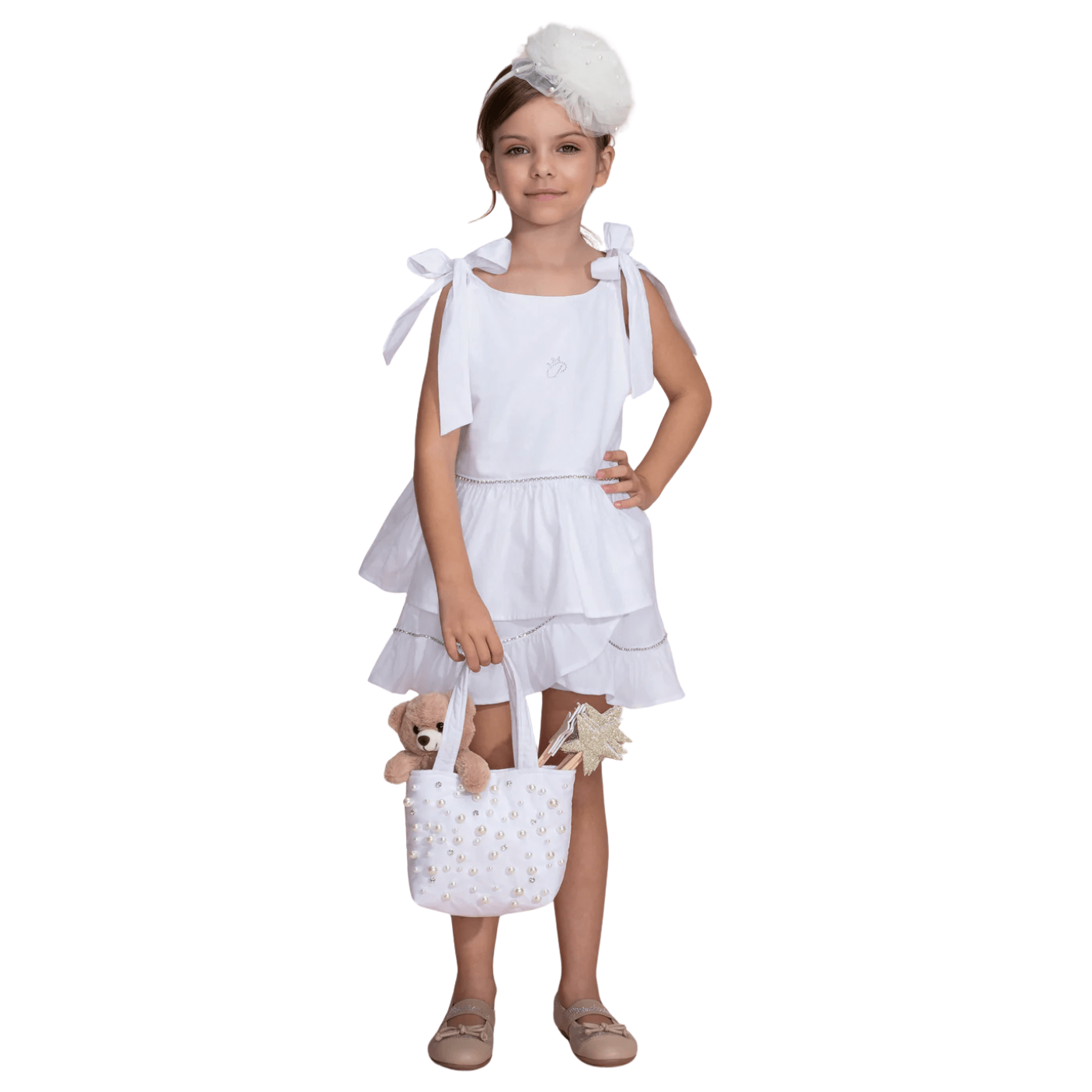 Confeccionado em tricoline macio e fresquinho, o conjunto é composto por uma blusa com laços nos ombros — detalhe clássico e encantador da marca — e uma saia com camadas em babados fluidos que garantem movimento e leveza. O acabamento com strass delicados adiciona brilho na medida certa, tornando a peça ainda mais especial sem perder a sutileza.
