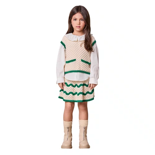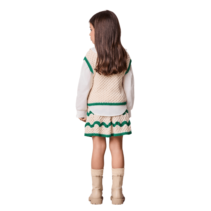 O Conjunto Infantil Tricot Colete com Saia Cru e Verde Anime é a escolha ideal para composições elegantes e modernas no inverno infantil.