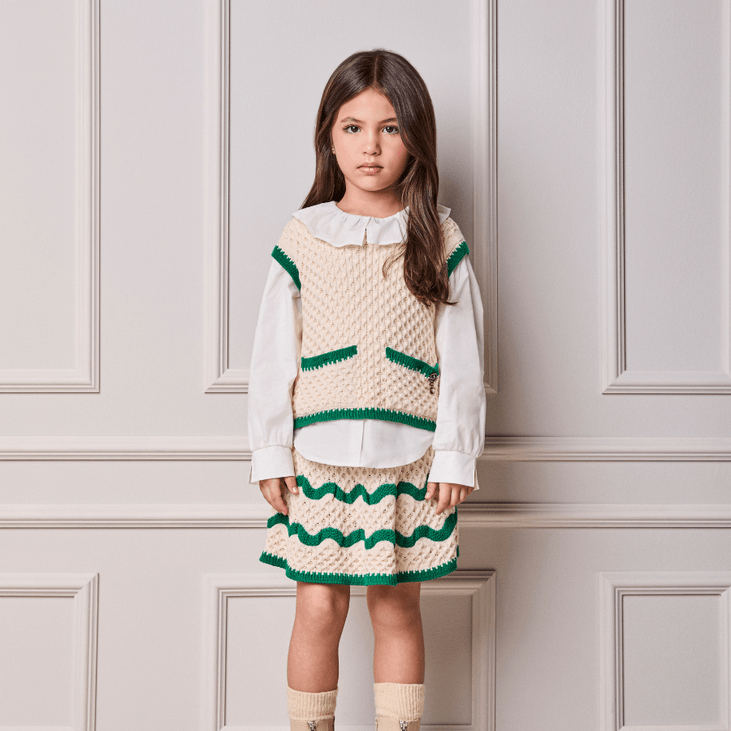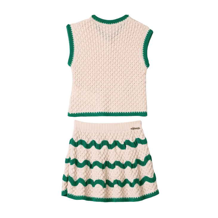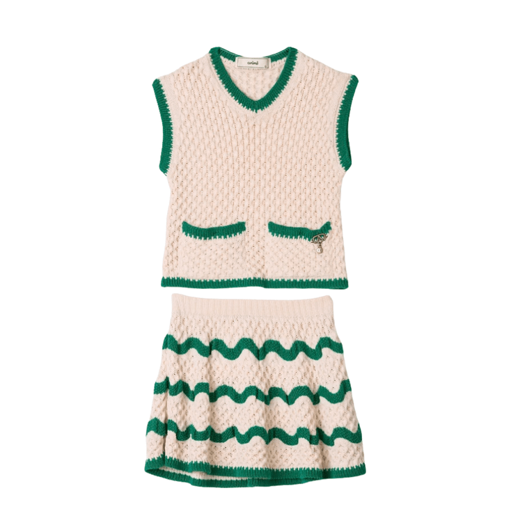 Confeccionado em tricot estruturado na base cru com detalhes em verde, o conjunto é composto por colete com acabamento contrastante e saia coordenada com padronagem delicada. Uma proposta sofisticada, confortável e atemporal para meninas que amam se vestir com estilo.
