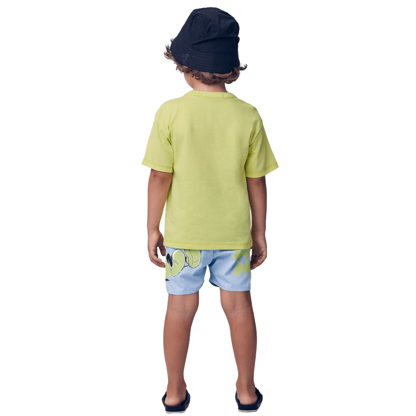 A camiseta em tom verde melão tem modelagem soltinha e estampa frontal moderna do Mickey, enquanto o shorts azul claro em tecido leve conta com estampa maxi do personagem e cós elástico, proporcionando liberdade de movimento e praticidade no vestir.