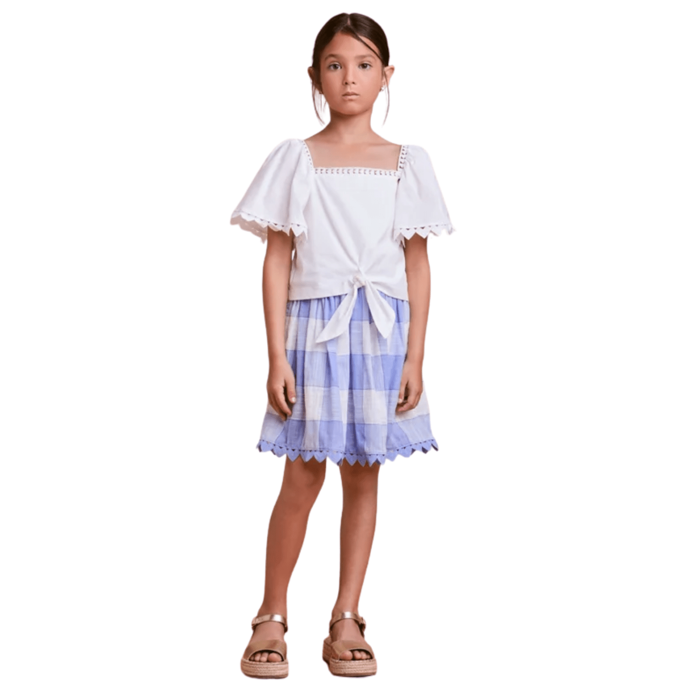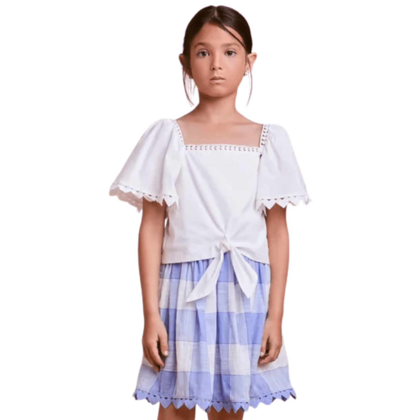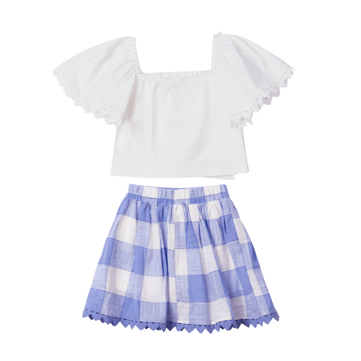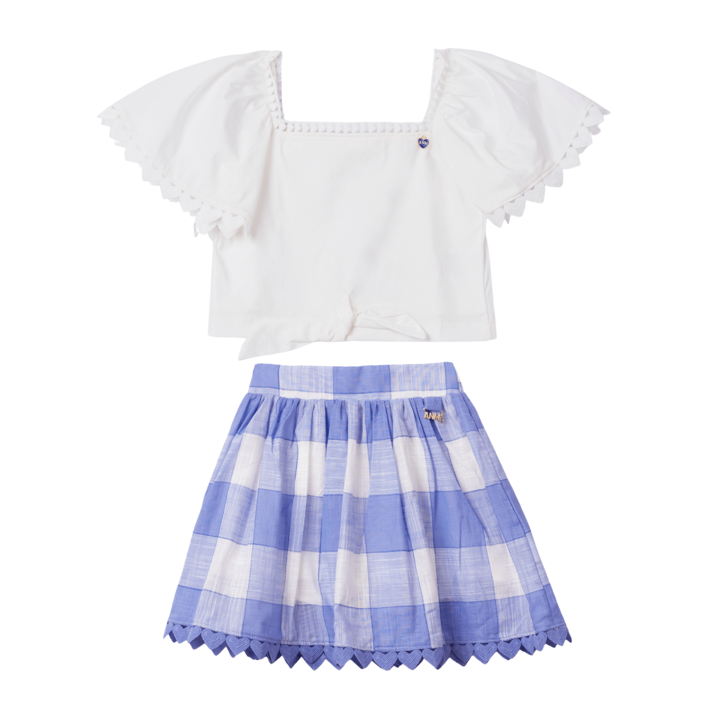 A blusa branca apresenta mangas amplas com acabamento em sianinha de corações, trazendo um detalhe romântico e encantador. Sua modelagem soltinha proporciona conforto e frescor, perfeito para os dias mais quentes. Já a saia em estampa xadrez azul e branco adiciona um ar clássico e moderno ao visual, com caimento fluido e acabamento delicado na barra que valoriza ainda mais o design.