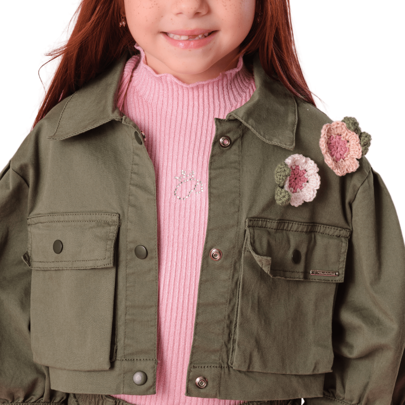 O grande destaque fica por conta das aplicações manuais de rosas em crochê na parte frontal, um detalhe artesanal que confere exclusividade, delicadeza e encanto à jaqueta.
