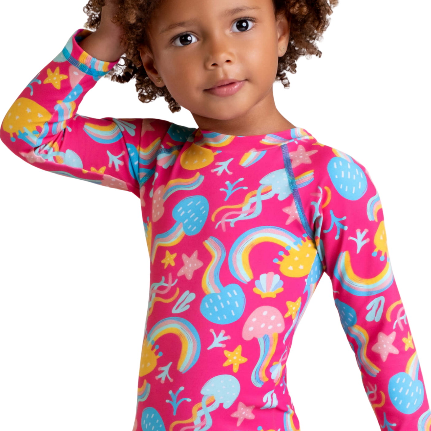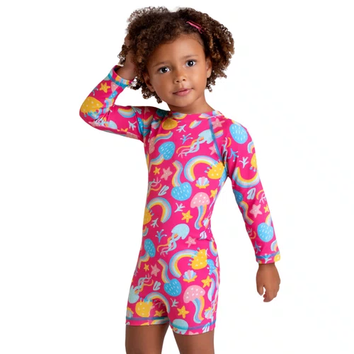 A estampa vibrante com água-vivas, arco-íris e estrelas do mar traz o encanto do fundo do oceano em cores alegres que inspiram alegria e energia. Além disso, o modelo biker — com mangas longas e shorts integrados — oferece cobertura ideal e praticidade para as crianças brincarem com segurança e estilo.