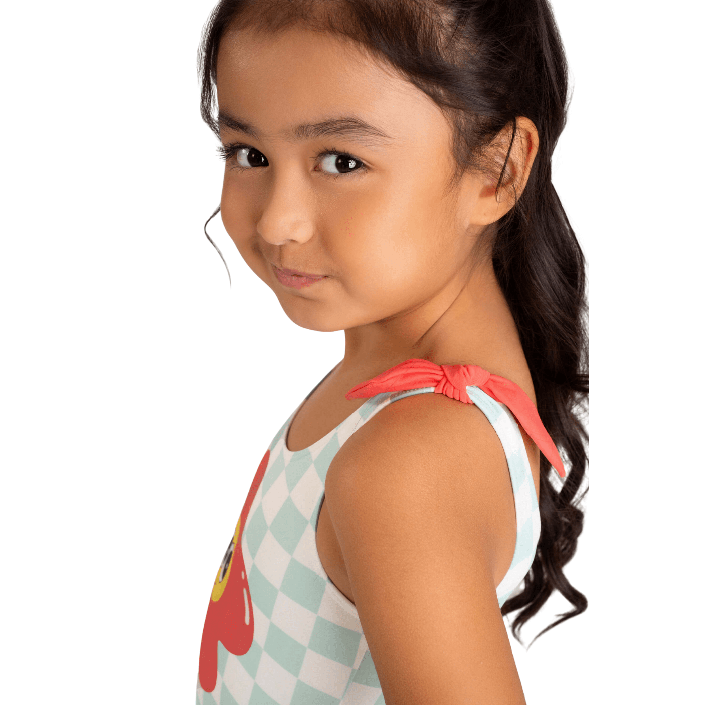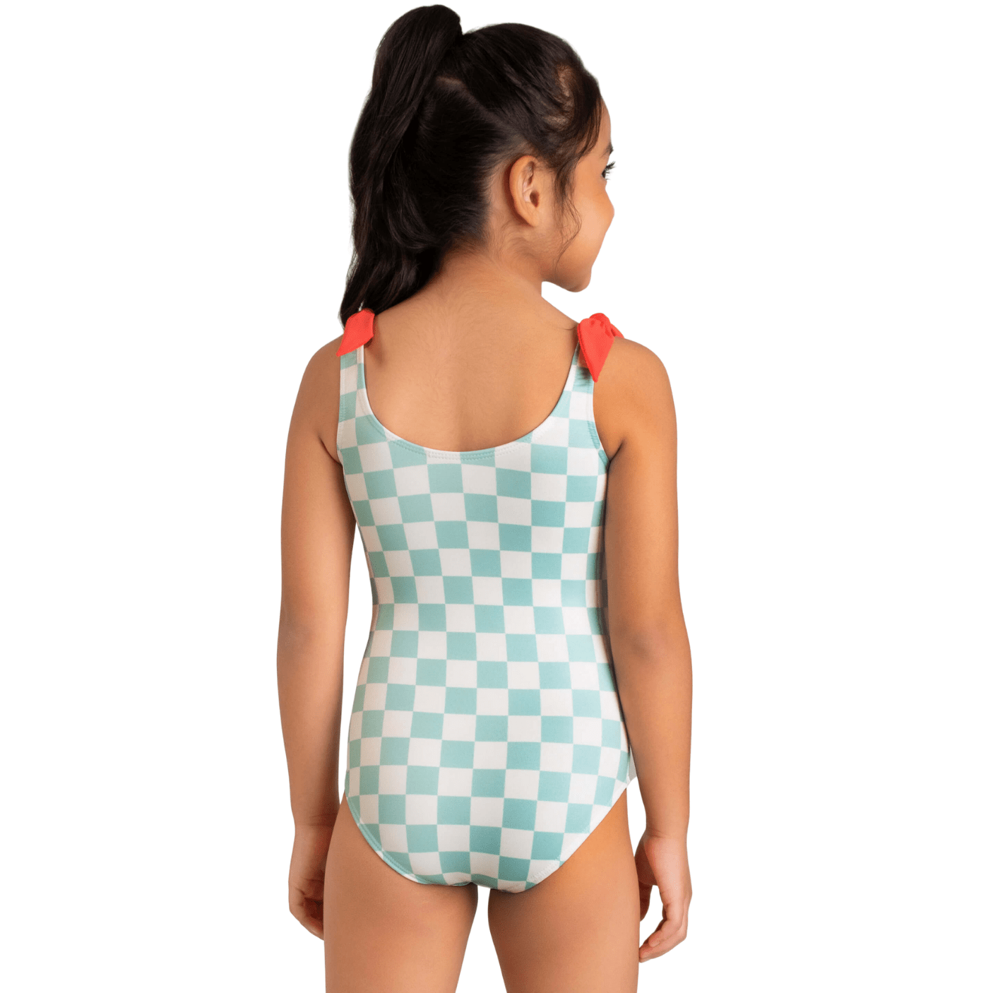 A estampa quadriculada em verde água com florzinha divertida no centro transmite um visual moderno e cheio de personalidade, enquanto as alcinhas com amarração em laço vermelho dão um toque delicado e encantador.
