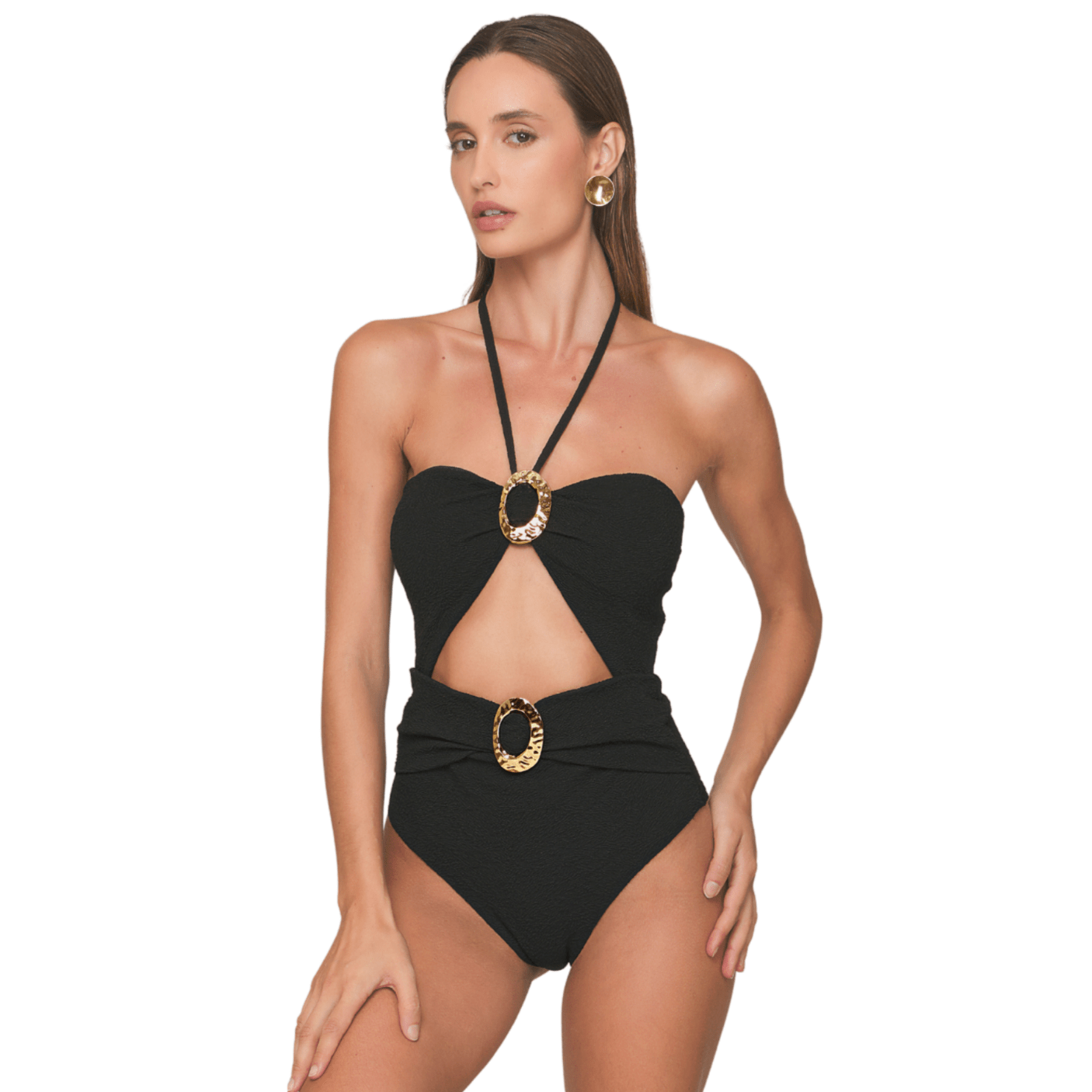 O design moderno apresenta recorte frontal estratégico, que cria um efeito de cintura marcada e traz sensualidade na medida certa. O destaque fica por conta dos detalhes em argolas douradas, que adicionam sofisticação e um toque de luxo ao visual. Com modelagem regular, o maiô oferece segurança e caimento impecável, sendo ideal para diferentes tipos de corpo.