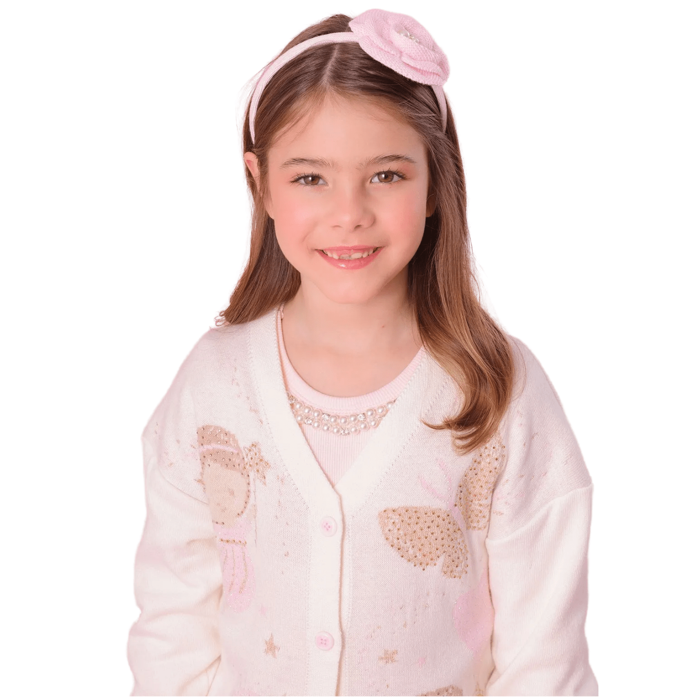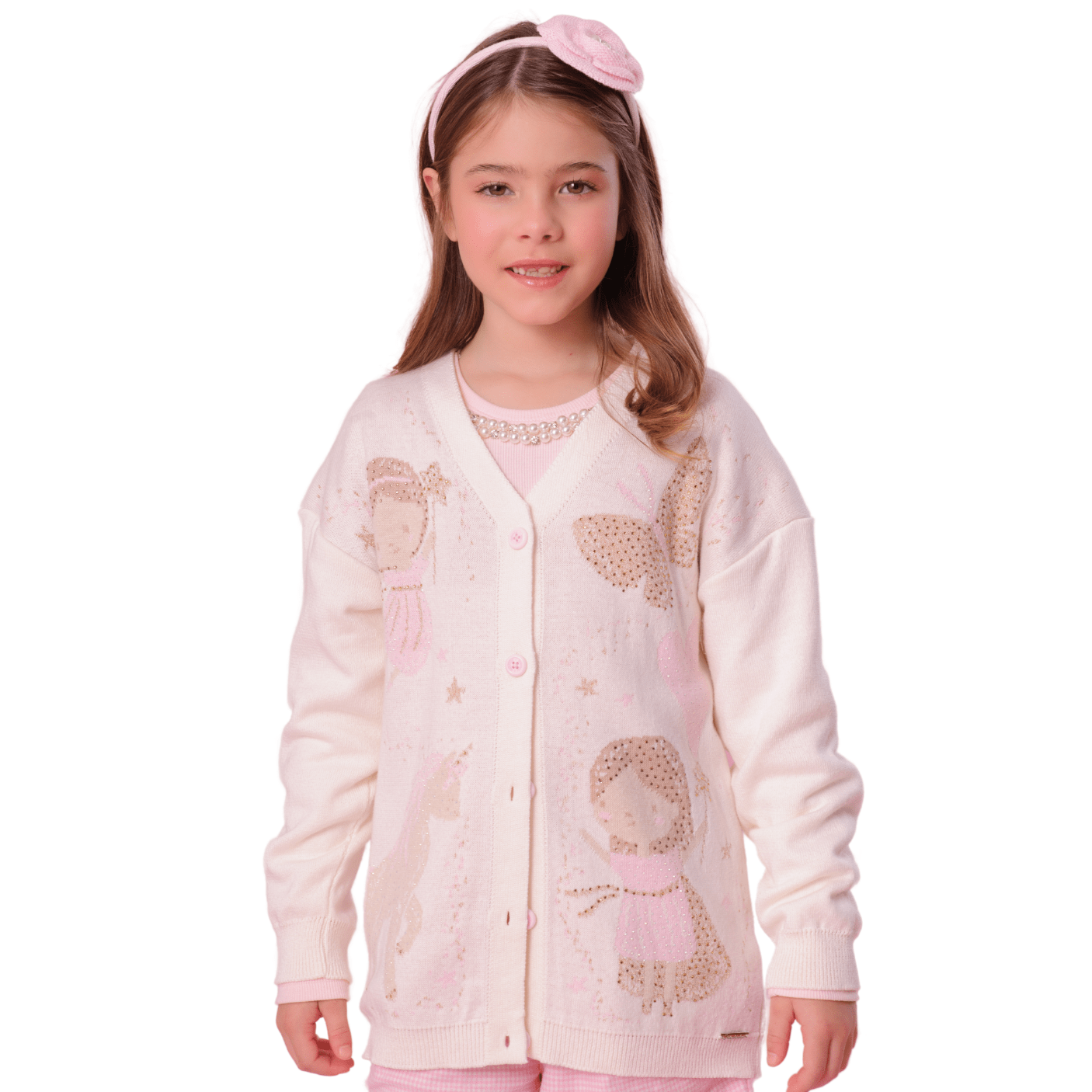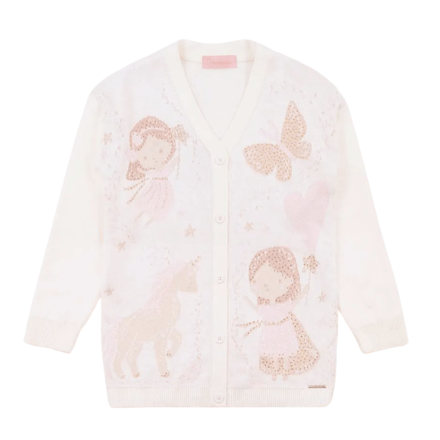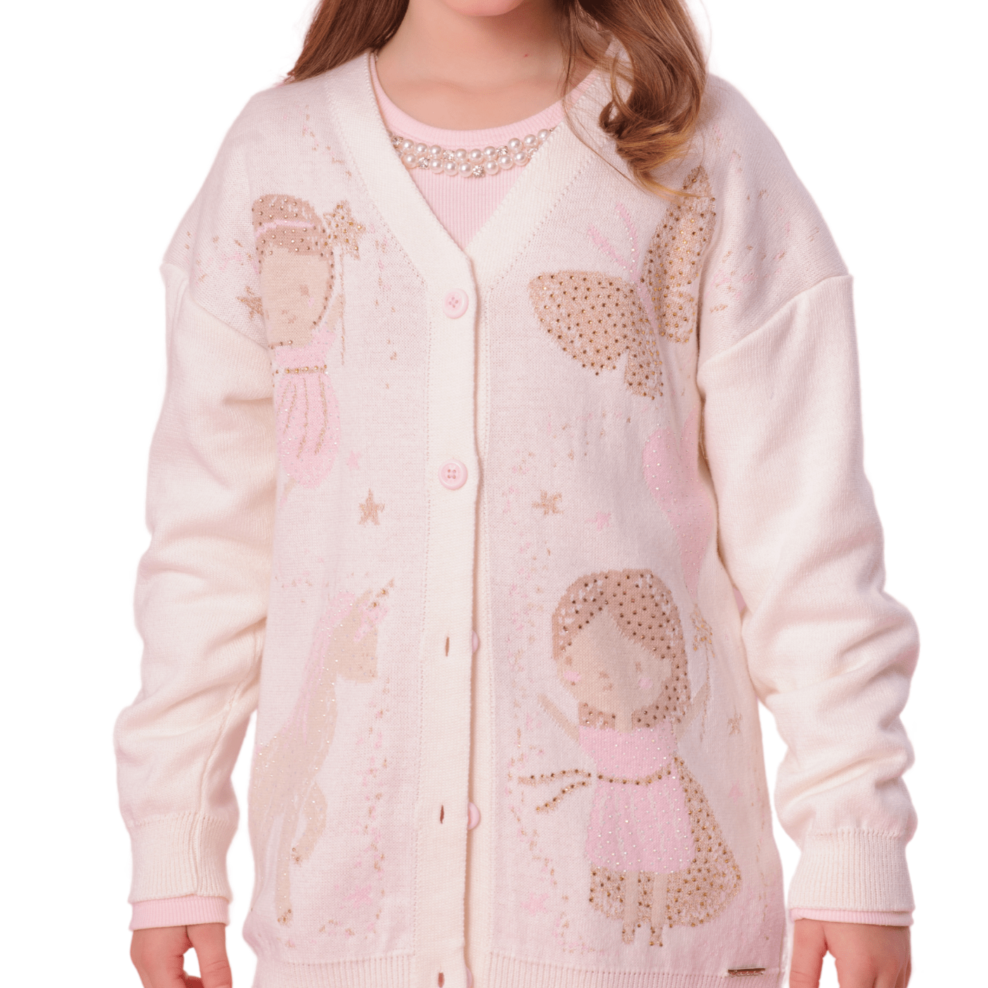 O fechamento frontal por botões adiciona praticidade e um charme atemporal, enquanto o detalhe frontal com desenhos encantadores de fadas e unicórnios, enriquecido com a aplicação de cristais, confere um brilho especial e um ar de fantasia à peça.