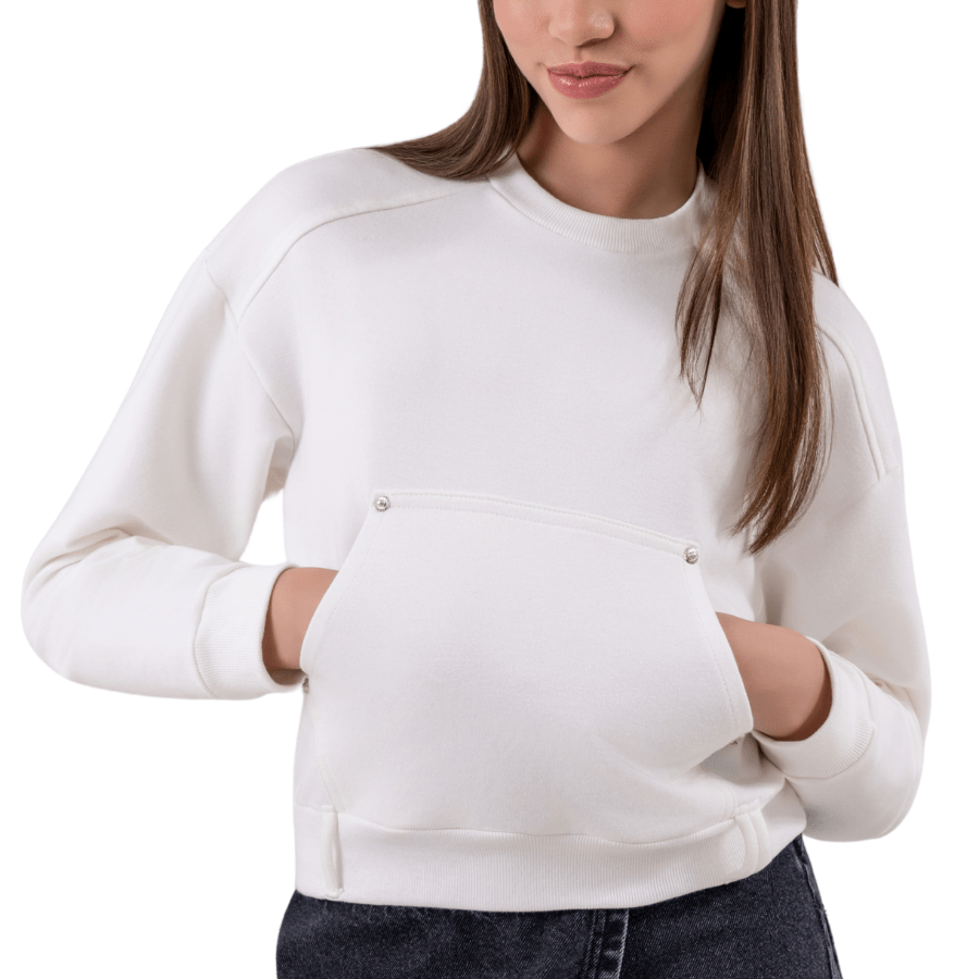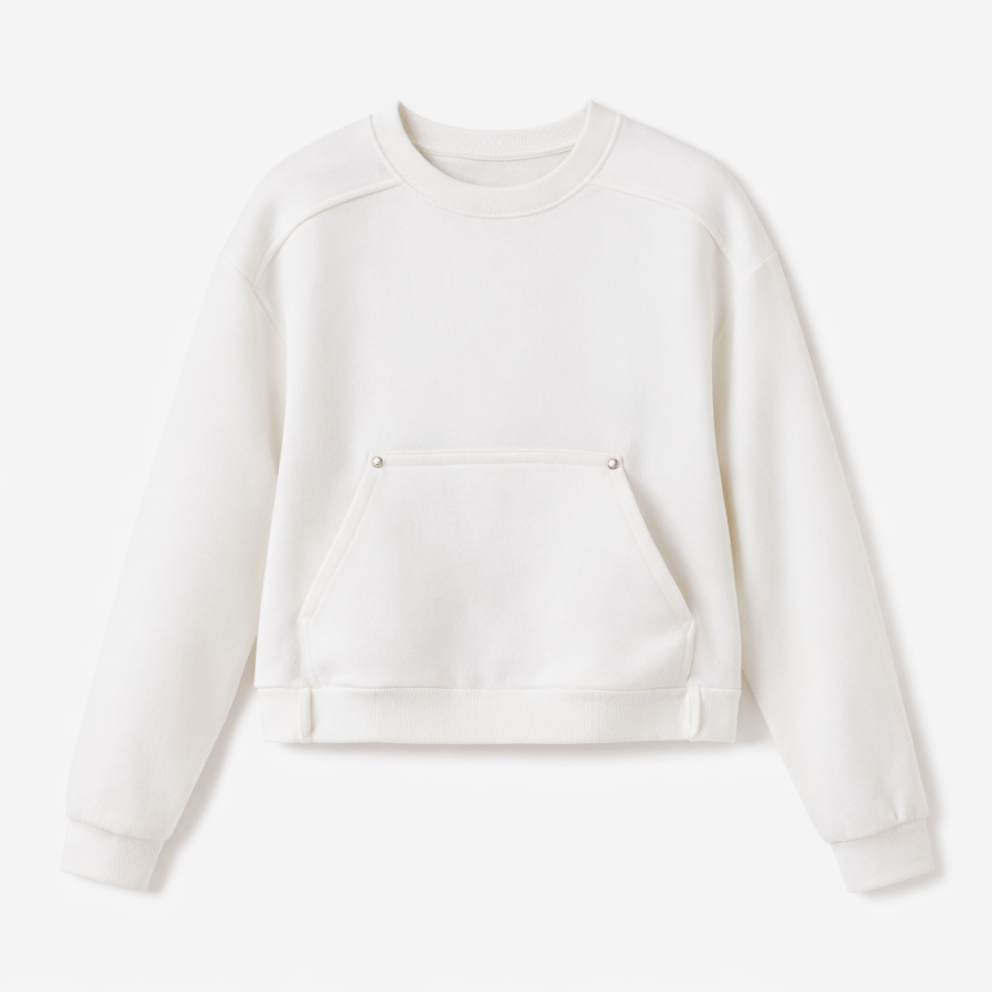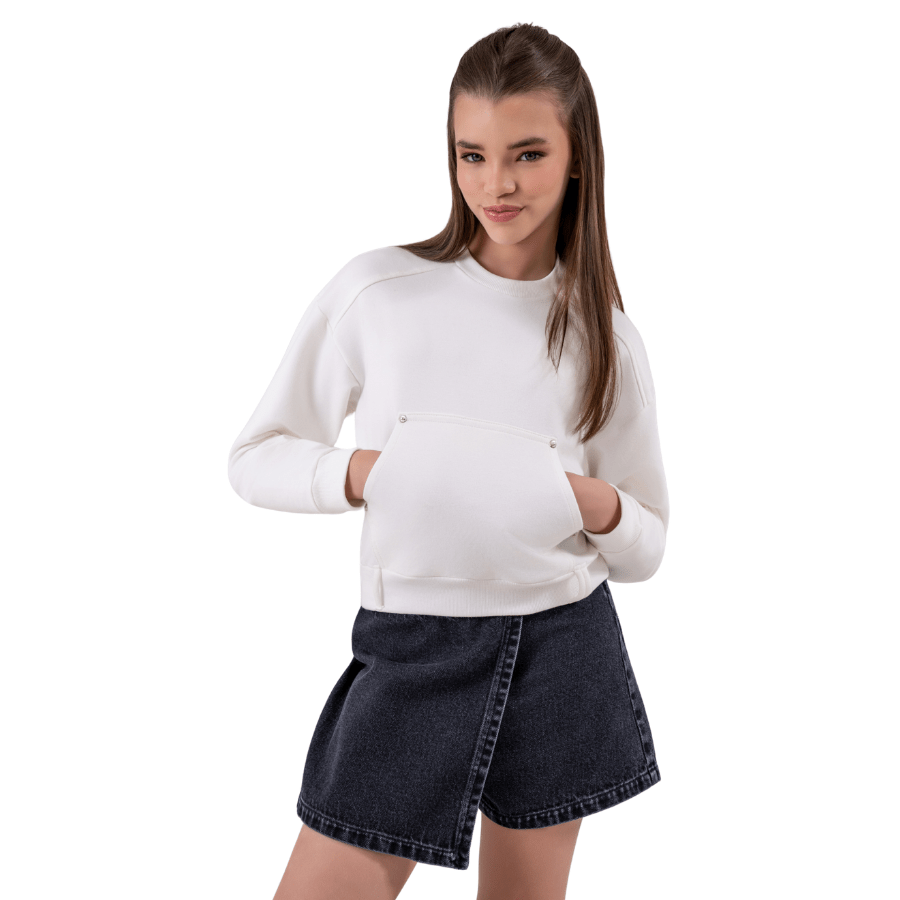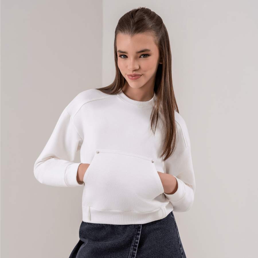 Com design clean e modelagem moderna, ele traz bolso frontal estilo canguru com detalhe discreto que agrega charme e funcionalidade. O tom off white é atemporal e combina com absolutamente tudo — do jeans ao look mais fashionista.