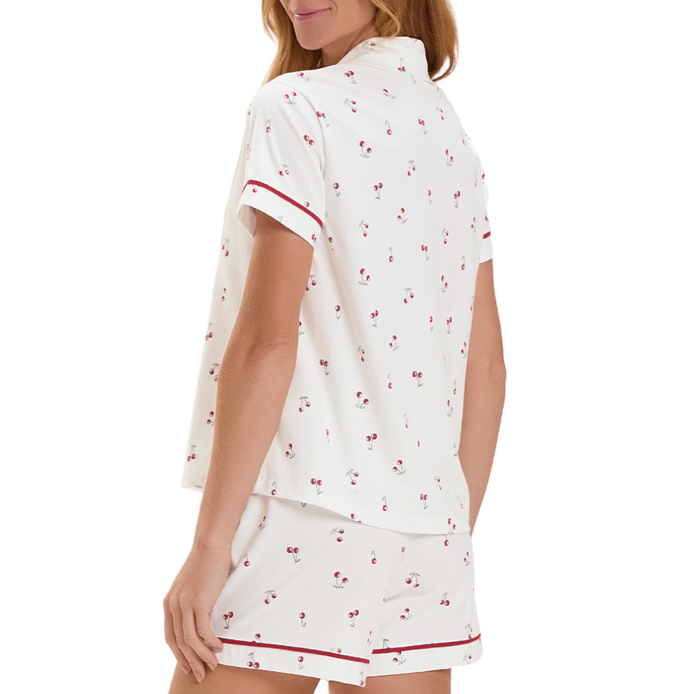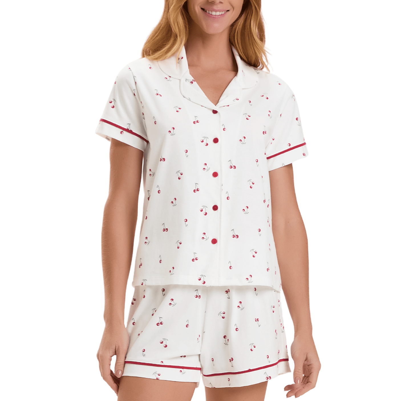 pijama curto feminino, pijama cereja cor com amor, pijama verão feminino, pijama branco cerejinhas, pijama confortável, pijama aberto botões, moda sleepwear feminina, pijama delicado e estiloso