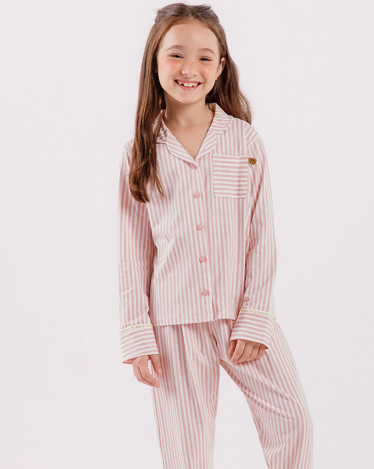Com uma clássica estampa de listras em tom de rosa, o conjunto combina charme atemporal e modernidade. A blusa traz um detalhe especial: um bolso lateral aplicado, adornado com uma delicada etiqueta bandeira personalizada de ursinho, que acrescenta um toque lúdico e encantador. As mangas contam com punho molde, onde a estampa de listras surge em sentido oposto, criando um contraste interessante e harmonioso. Para um acabamento diferenciado, um cadarço personalizado complementa o design, conferindo um ar moderno e descontraído. Além disso, a abertura funcional da blusa garante praticidade sem abrir mão da elegância.