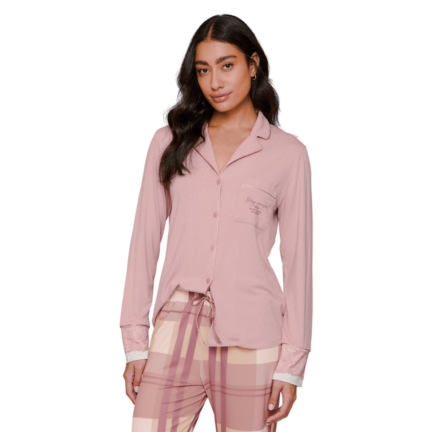 Delicadeza, conforto e elegância definem o Pijama Feminino Aberto. A blusa é confeccionada em viscolycra premium, com toque extremamente macio, abertura frontal com botões personalizados e acabamento em filete. Os punhos contrastantes com renda sobreposta adicionam um charme delicado e feminino à peça.