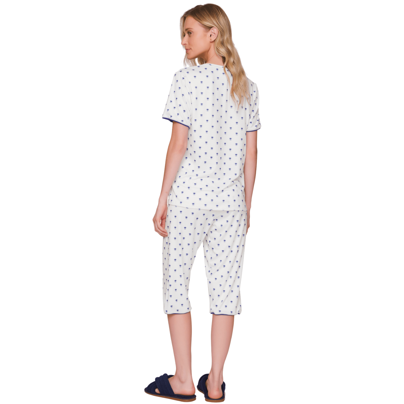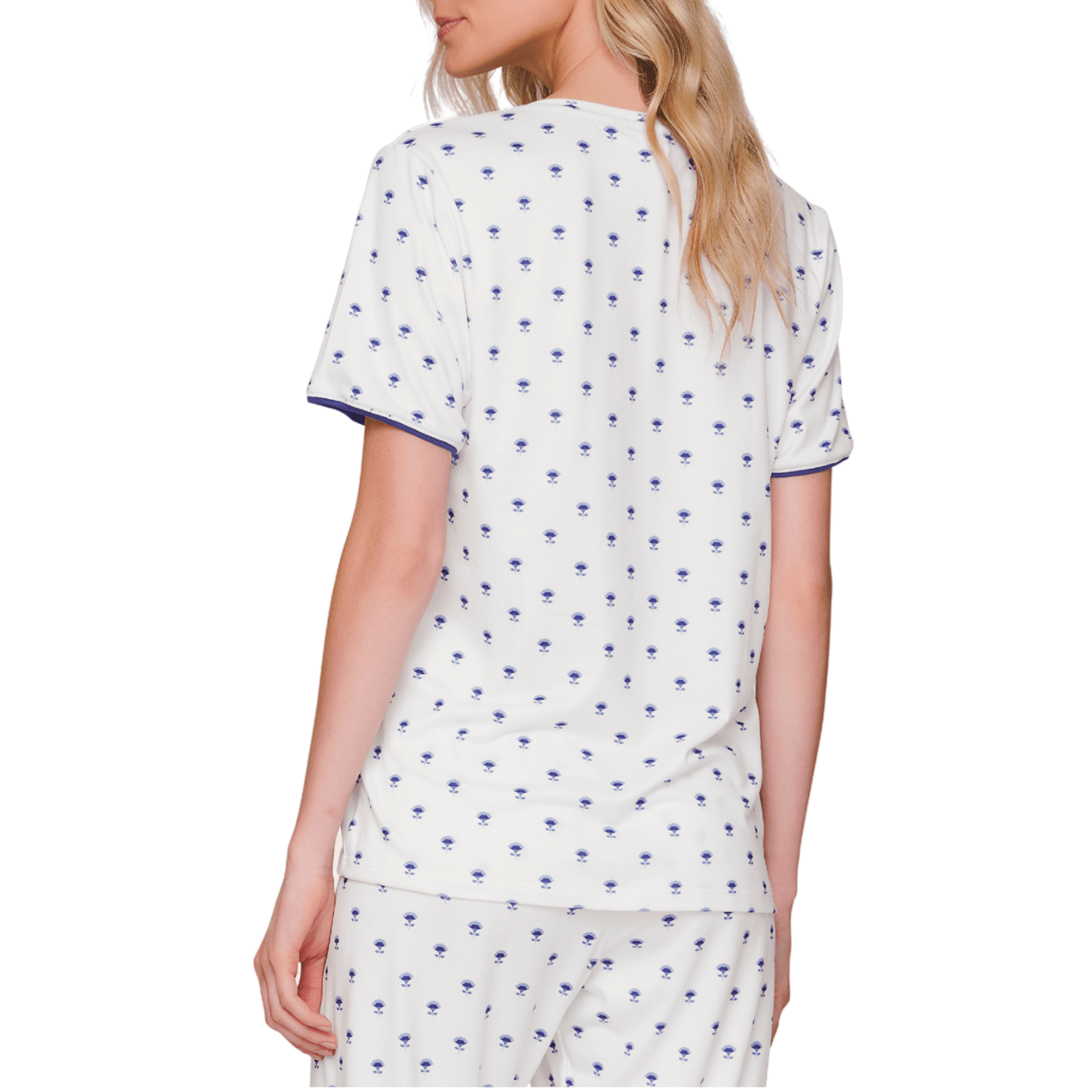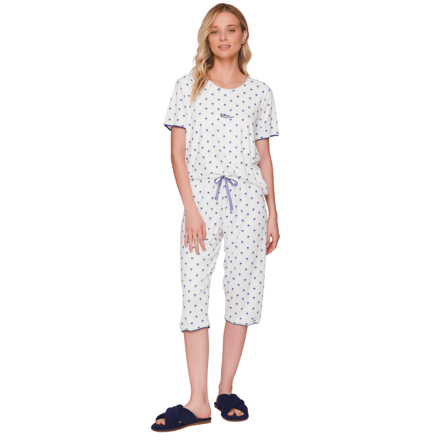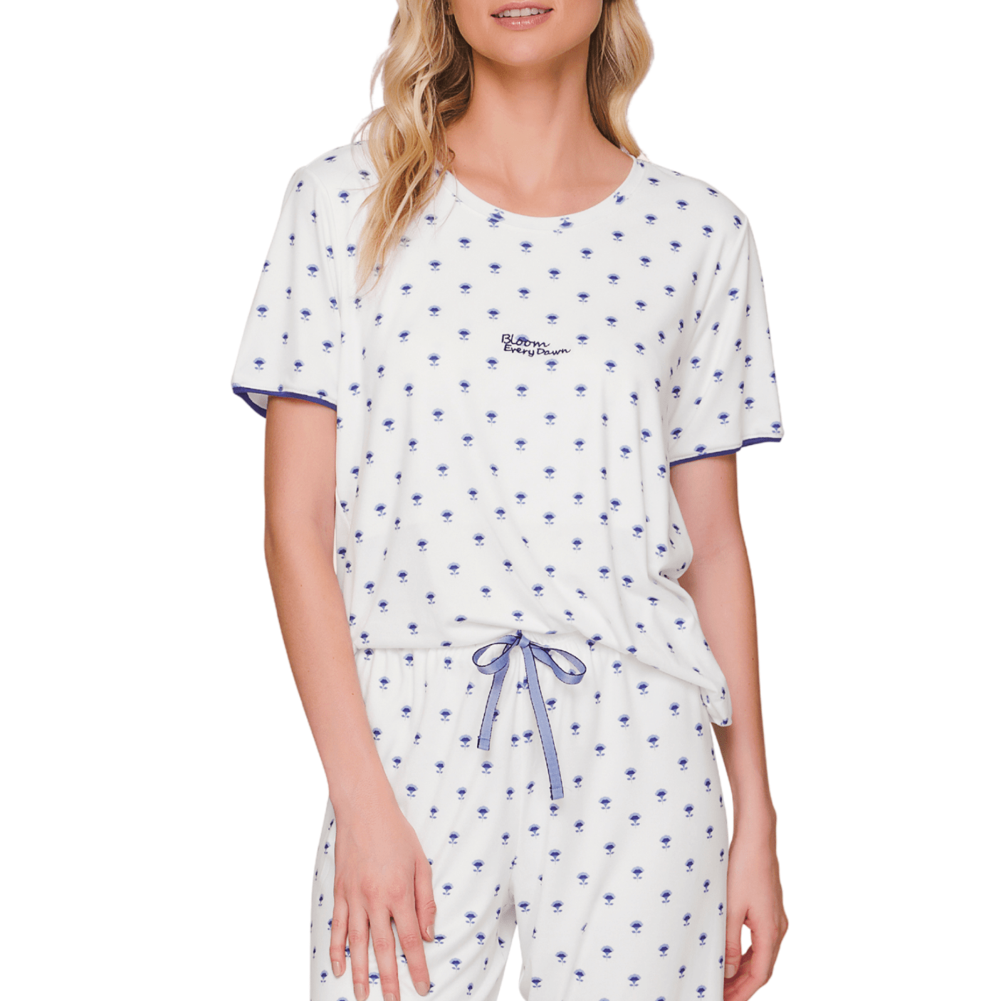 A blusa possui modelagem clássica com decote redondo, acabamento em viés azul e estampa de mini flores, transmitindo um visual aconchegante e feminino. A calça capri tem cintura com elástico, amarração ajustável e comprimento abaixo do joelho, proporcionando liberdade de movimentos e frescor ideal para as noites mais quentes.