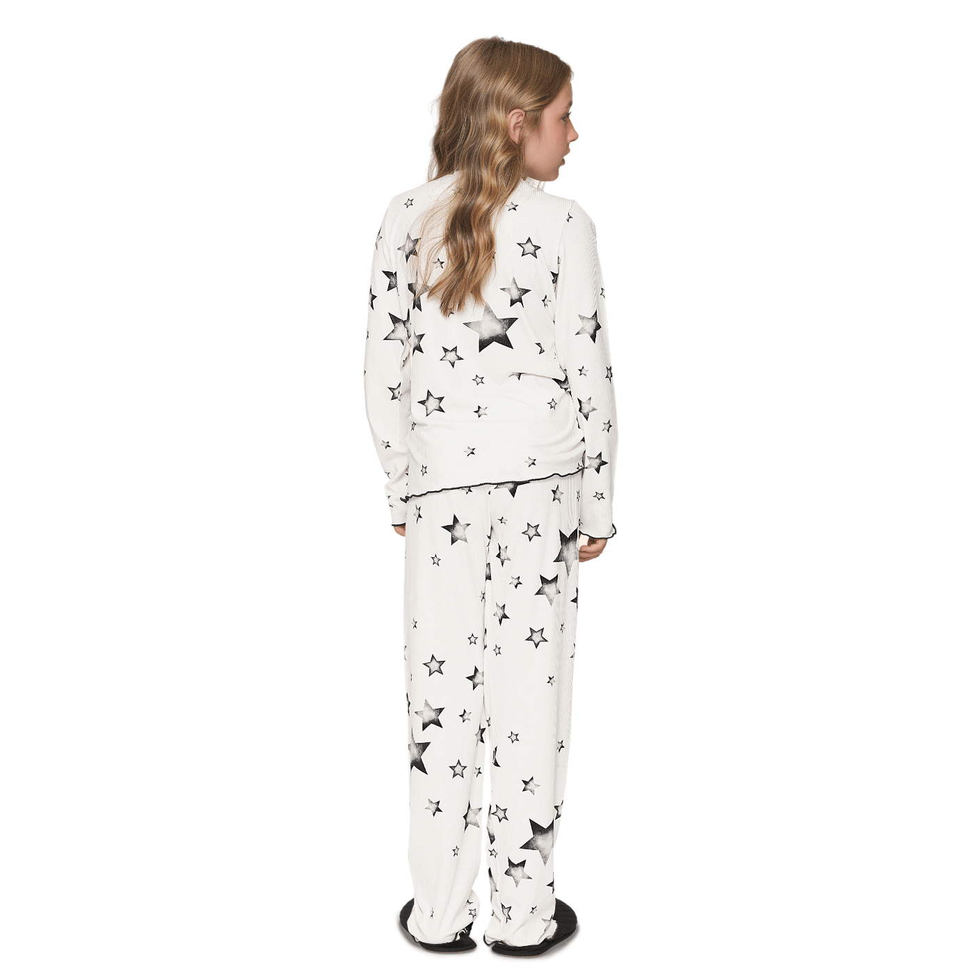 A blusa de manga longa traz um delicado acabamento em frufru de cor contrastante e uma etiqueta decorativa que dá um toque extra de charme à peça. A calça com modelagem ampla possui elástico interno no cós, oferecendo ajuste perfeito sem apertar, e também conta com acabamento em frufru na barra, completando o visual com suavidade.