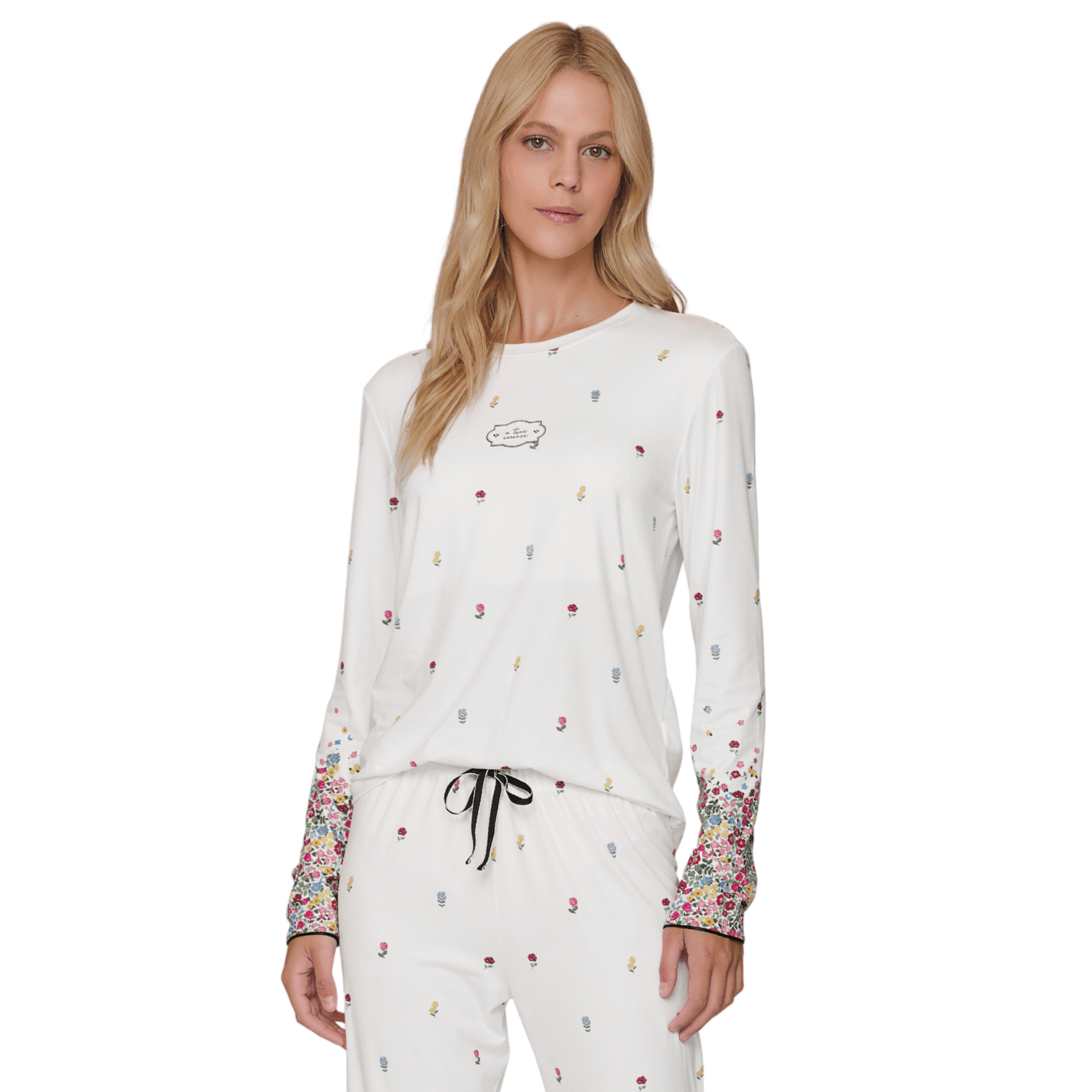 Sua blusa de manga longa apresenta uma charmosa arte localizada na parte frontal, que adiciona um toque moderno e sofisticado ao visual, enquanto os filetes aplicados no acabamento das mangas enriquecem o design com um ar refinado e feminino. A modelagem confortável favorece o caimento, proporcionando liberdade de movimento sem perder a elegância, tornando-o ideal tanto para dormir quanto para momentos de descanso ao longo do dia.