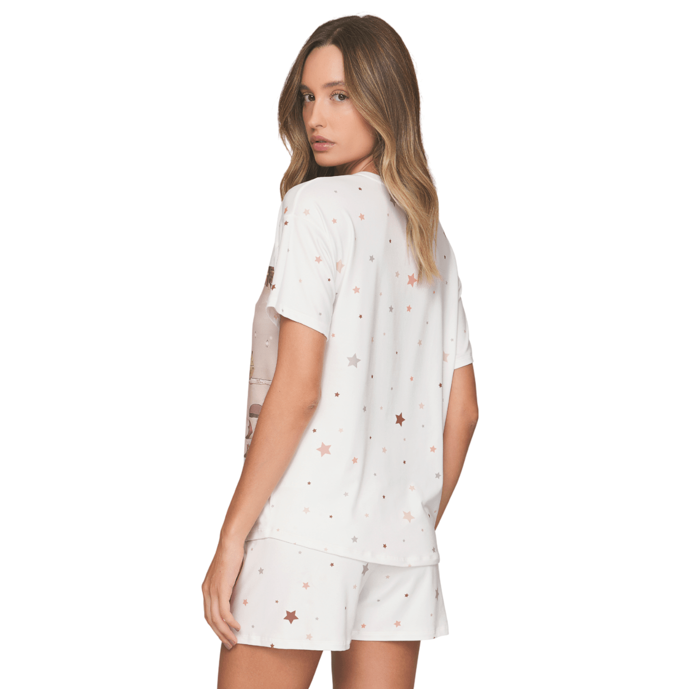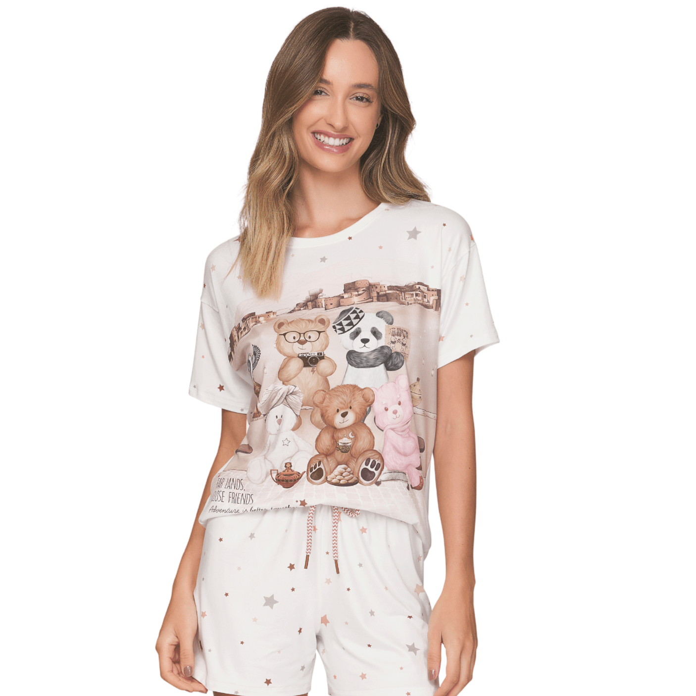Confeccionado em malha sublime touch, o pijama oferece um toque pele de pêssego, macio e aveludado, ideal para noites tranquilas e dias de descanso. A blusa com decote redondo em ribana canelada proporciona ajuste suave e confortável, enquanto o short com cós elástico e cordão decorativo garante praticidade com um toque de charme.