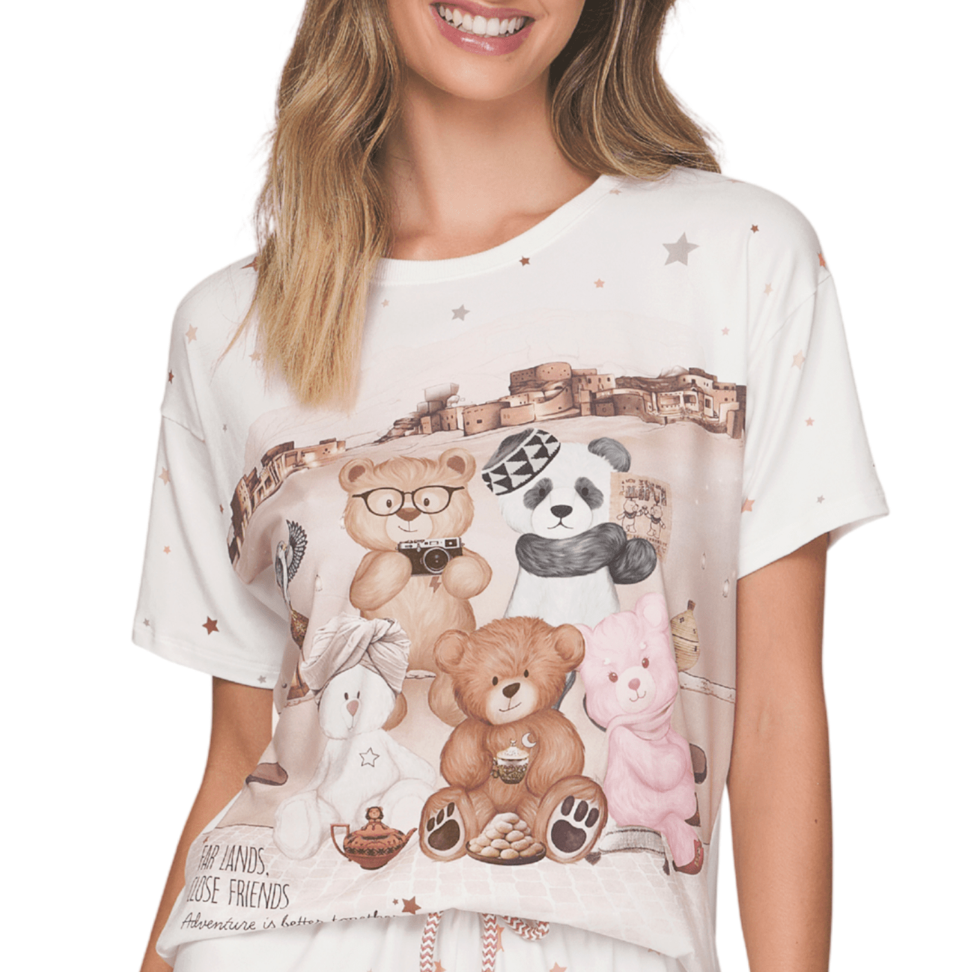Viva momentos de aconchego e imaginação com o Pijama Curto Estampa Hiden Place Lua Lua, uma peça que une conforto, arte e delicadeza. Com estampa exclusiva dos personagens Lua Lua em férias no Egito, o conjunto convida ao relaxamento em um universo encantador, onde até as estrelas parecem sussurrar.