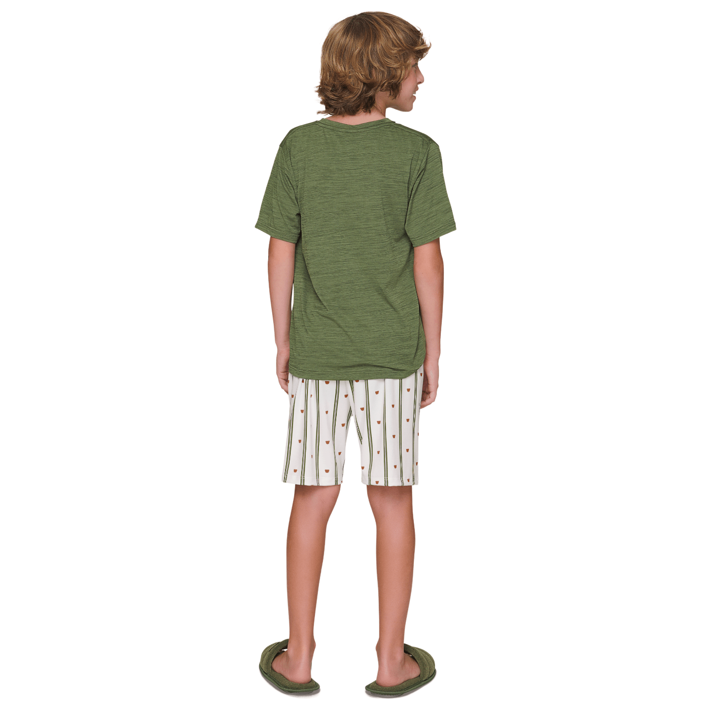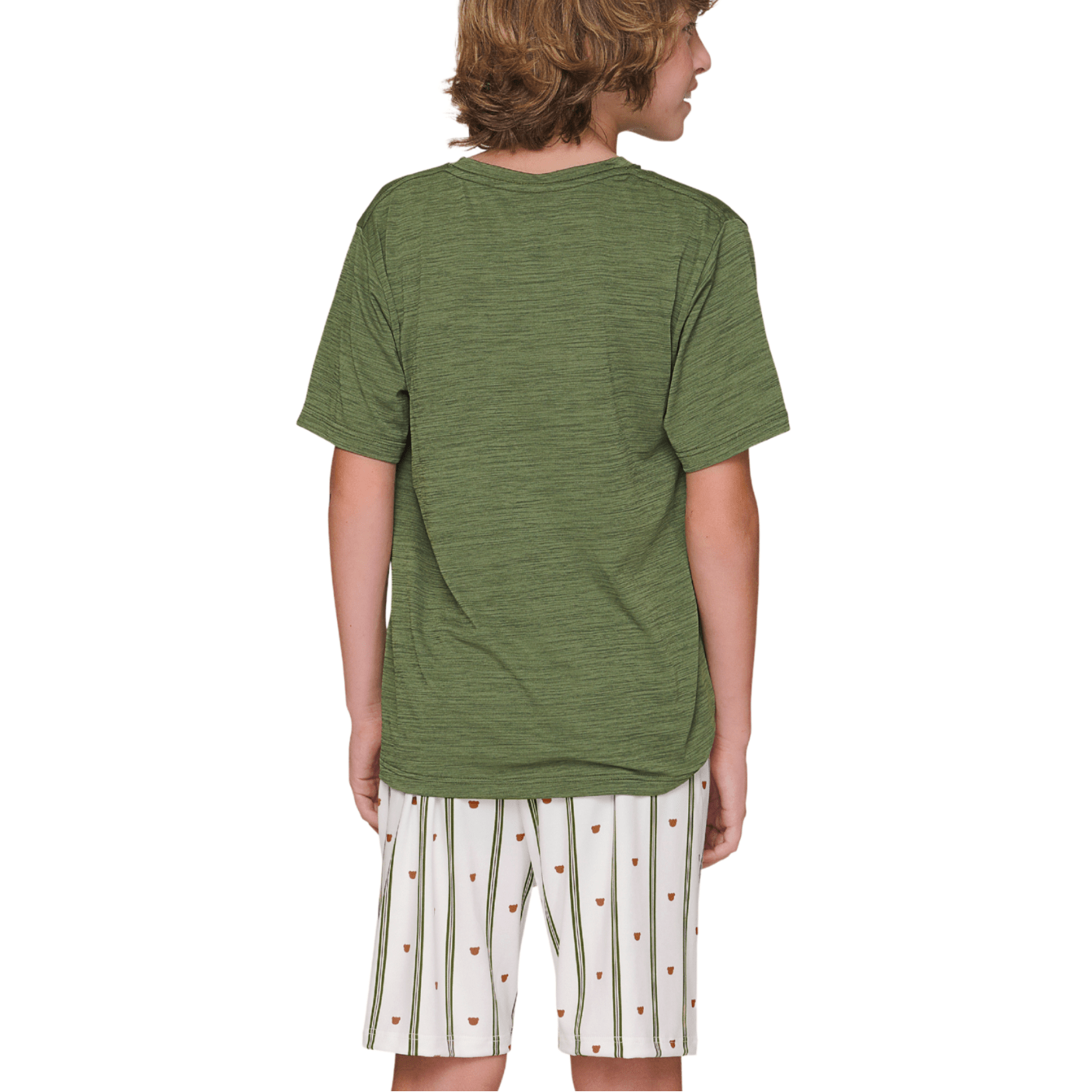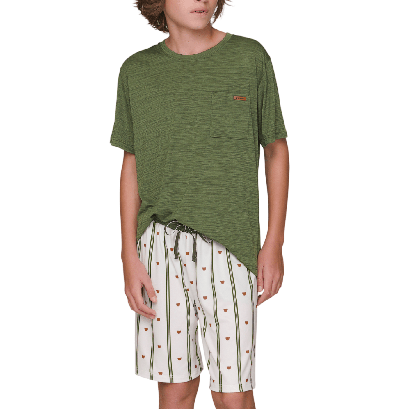 O Pijama Curto Infantil Menino In Bear We Trust Lua Lua combina conforto, modernidade e aquele charme divertido que só a Lua Lua sabe criar. A camiseta em verde musgo possui toque macio, caimento leve e bolso frontal que deixa o visual atual e despojado, ideal para noites tranquilas ou para relaxar em casa.